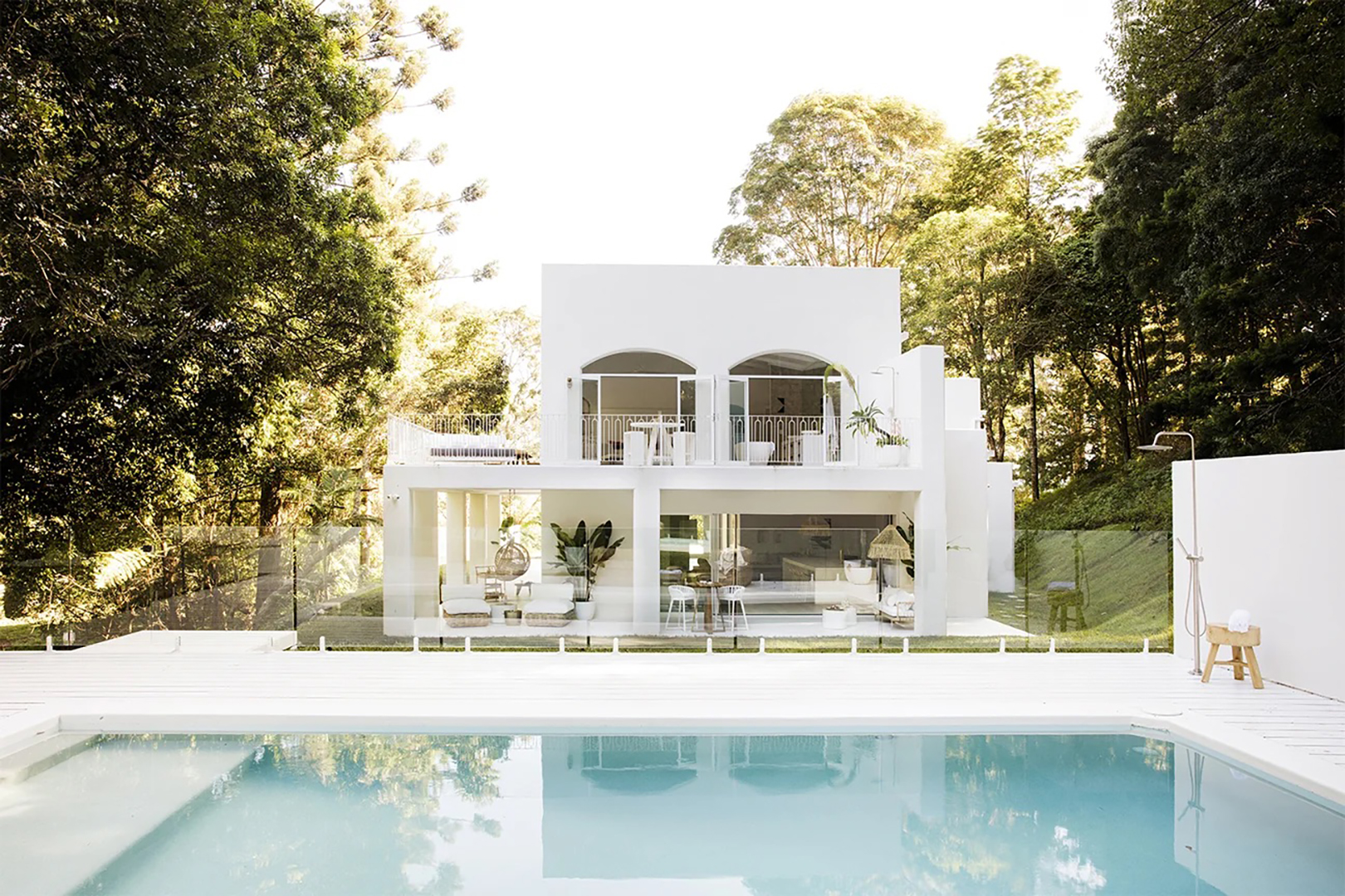 To ensure an impactful (and unobstructed) view of this white exterior house from every corner of the yard, Australian design-build firm Three Birds Renovations installed a glass fence around the perimeter of the pool. The benefit is twofold: From the kitchen, the owners can keep an eye on their kids swimming outside.