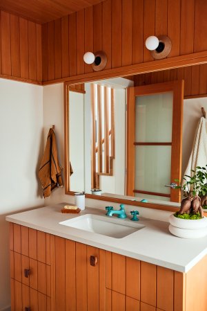 The problem was finding something that would jell with the rest of the home’s Scandinavian-inspired aesthetic. Higgins wasn’t about to stick a 40-jet, plastic-lined tub on the deck and call it a day. “I felt like it needed to be something that was more natural and minimal than that,” she says. As most things go now, Higgins was served the perfect solution via Instagram ad. A company out of Canada called Goodland that makes a cedar-clad wood-burning tub caught her eye.