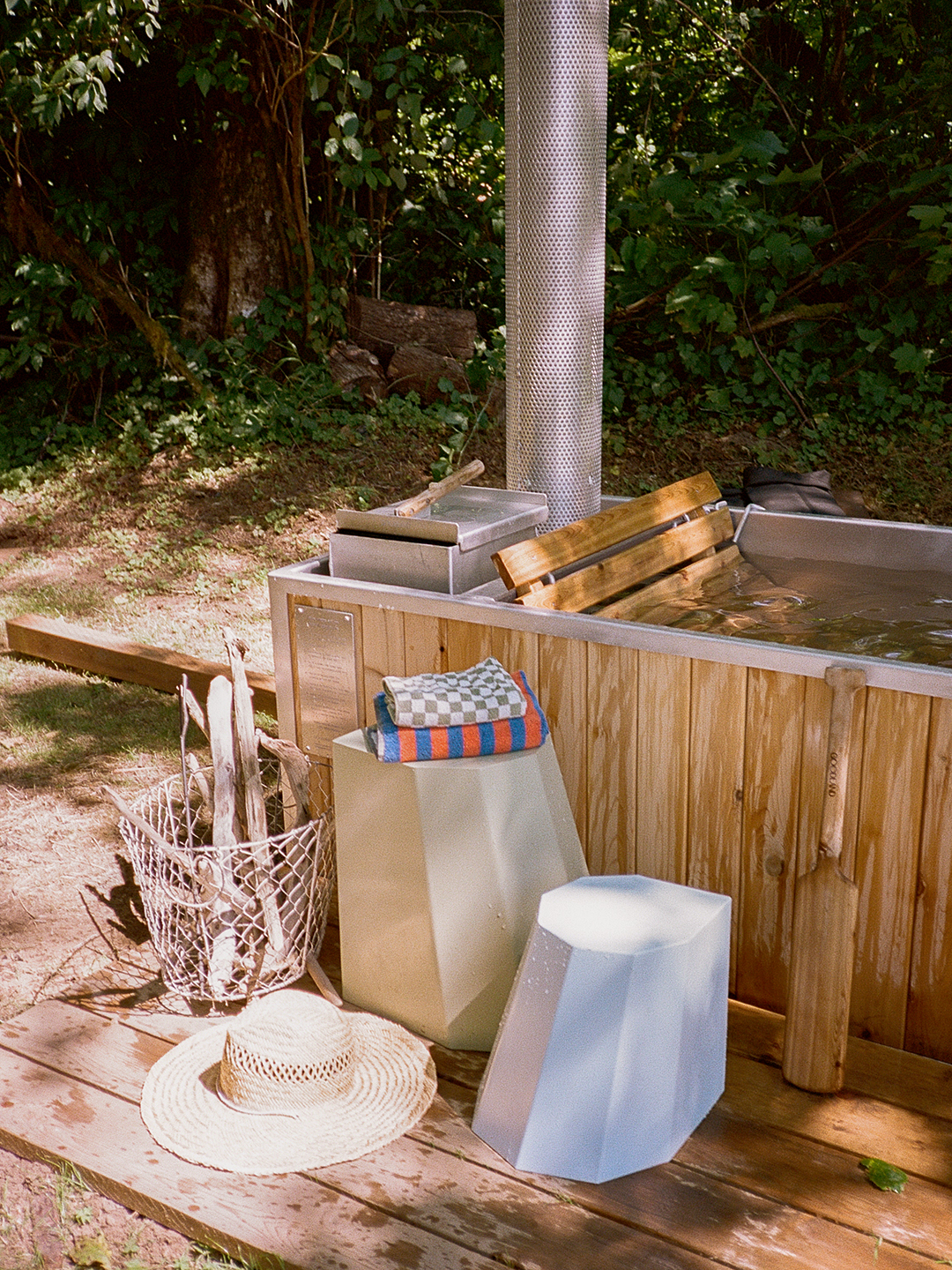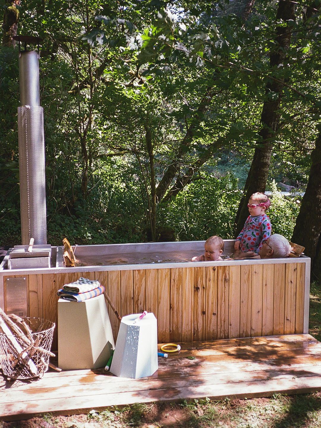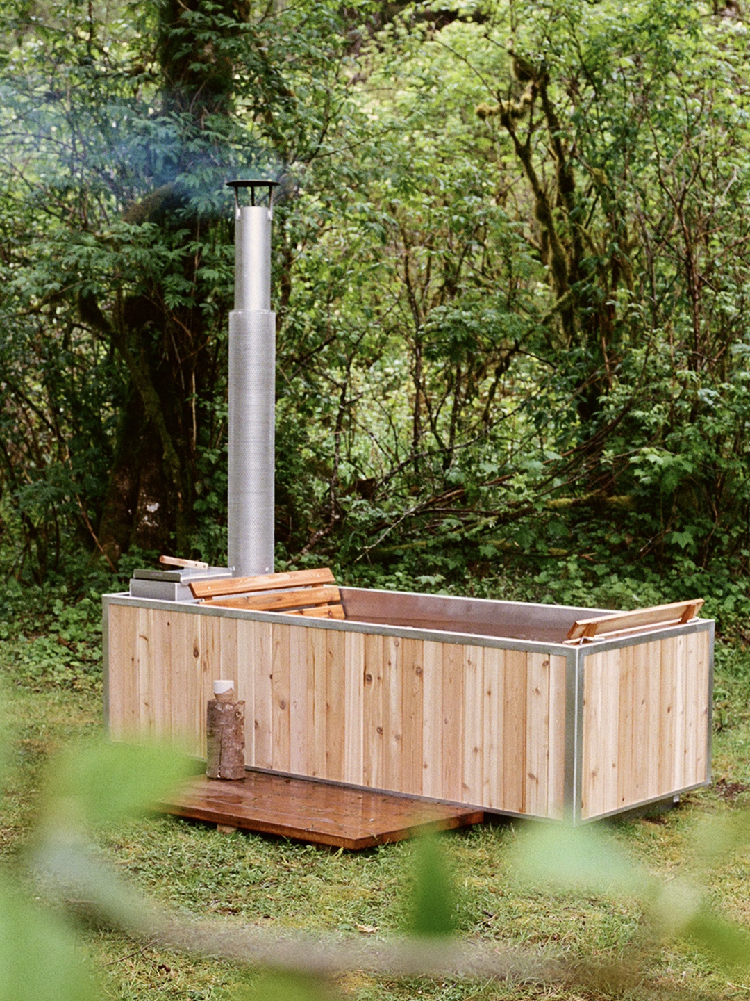 Like a wood stove you might find inside a cabin, Goodland’s tub gets its warmth from you making a fire and using the energy produced by the flames to produce heat. Luckily, it doesn’t take a ton of materials to get it going. After you’ve filled the basin with water, you’ll need paper, an armful of dry kindling, matches, and some firewood to get started. It typically takes around 90 minutes to heat the tub up, and once you’re in, you can let the fire smolder during your soak or add more logs as necessary to keep it going. It’s a hands-on process, but that’s exactly the point. “I just love the fact that it’s slow-burning,” says Higgins. “You’re out there stoking it, picking up bits of kindling from the land—it’s a lovely ritual. It’s not just like, ‘Okay, let’s jump in the tub.’”