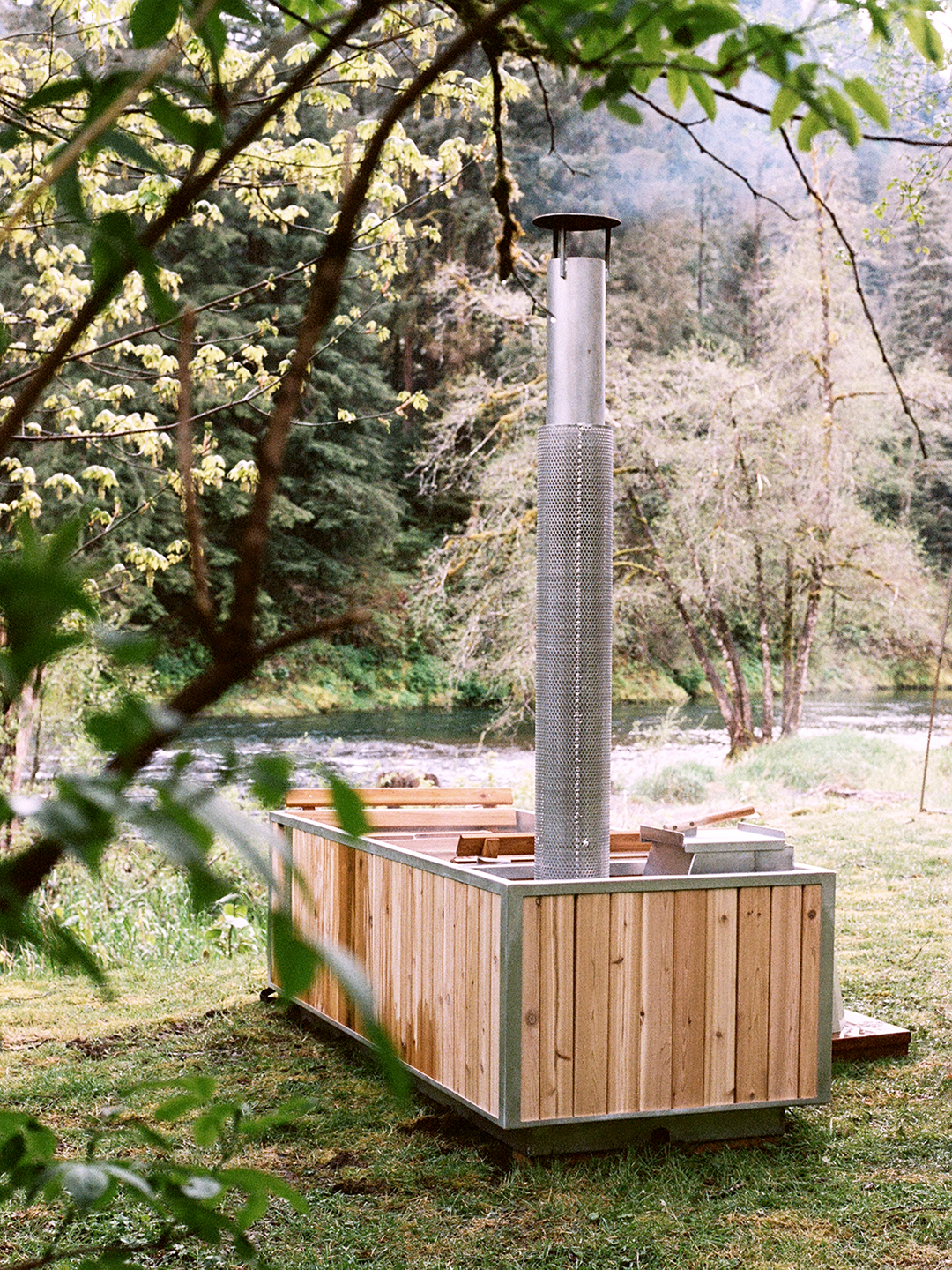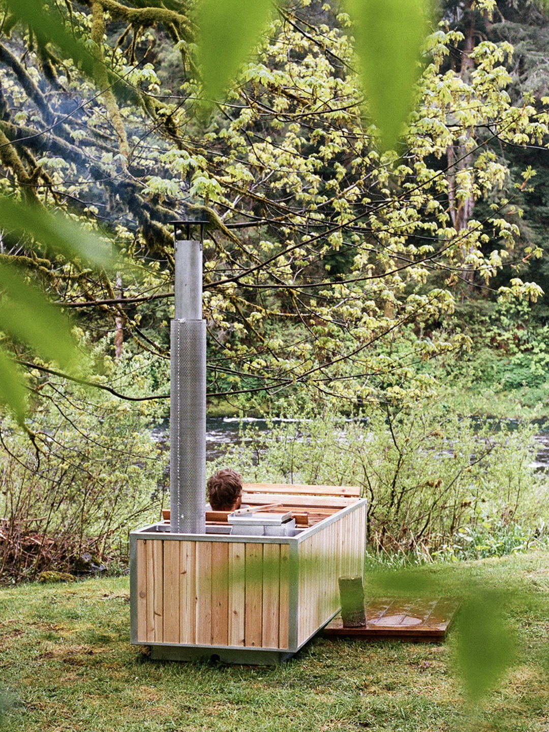 Knowing that the river can flood in the winter, Higgins and her husband didn’t want to put their tub too close to the water, but they still wanted it to feel totally separate from the house. “We’ve got it sort of beyond our firepit, so you’re out there. You feel like you’re by yourself,” she says.