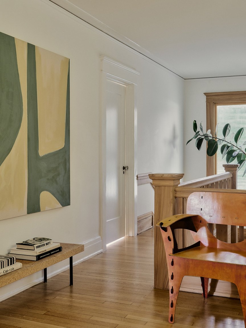 Creative director Elizabeth Spiridakis Olson is accustomed to making a statement, but she wasn’t quite sure what she wanted to say when it came to the design of the primary bedroom she shares with her husband. So, she hired designer Hollie Velten-Lattrell to help, and they agreed on using a colorful wallpaper filled with squiggly lines. In fact, this choice was ahead of its time, because Yelp’s report found that statement wallpaper is up 18 percent. You can follow suit with a chair rail that’s painted in a coordinating shade to inject a fun vibe.