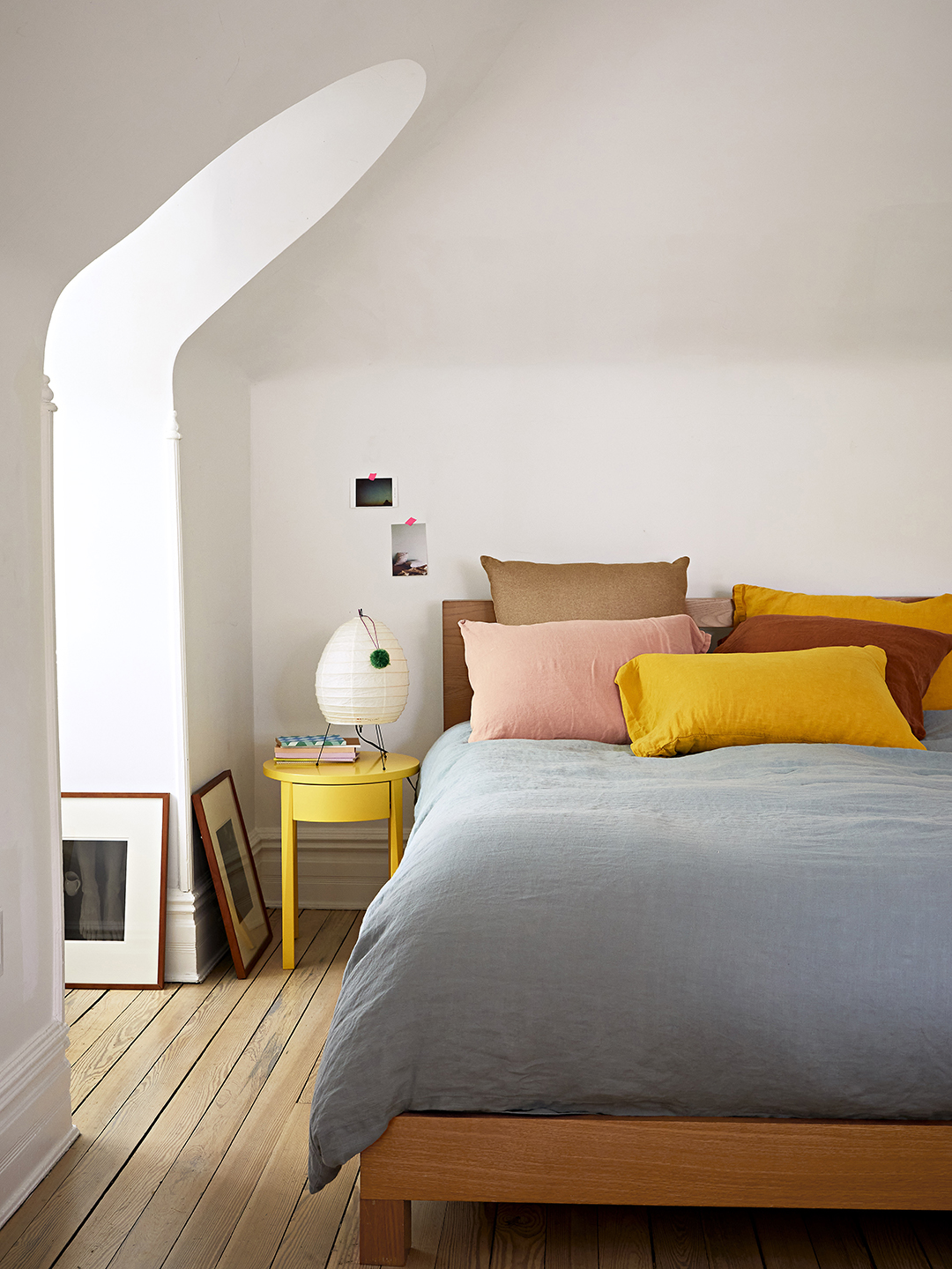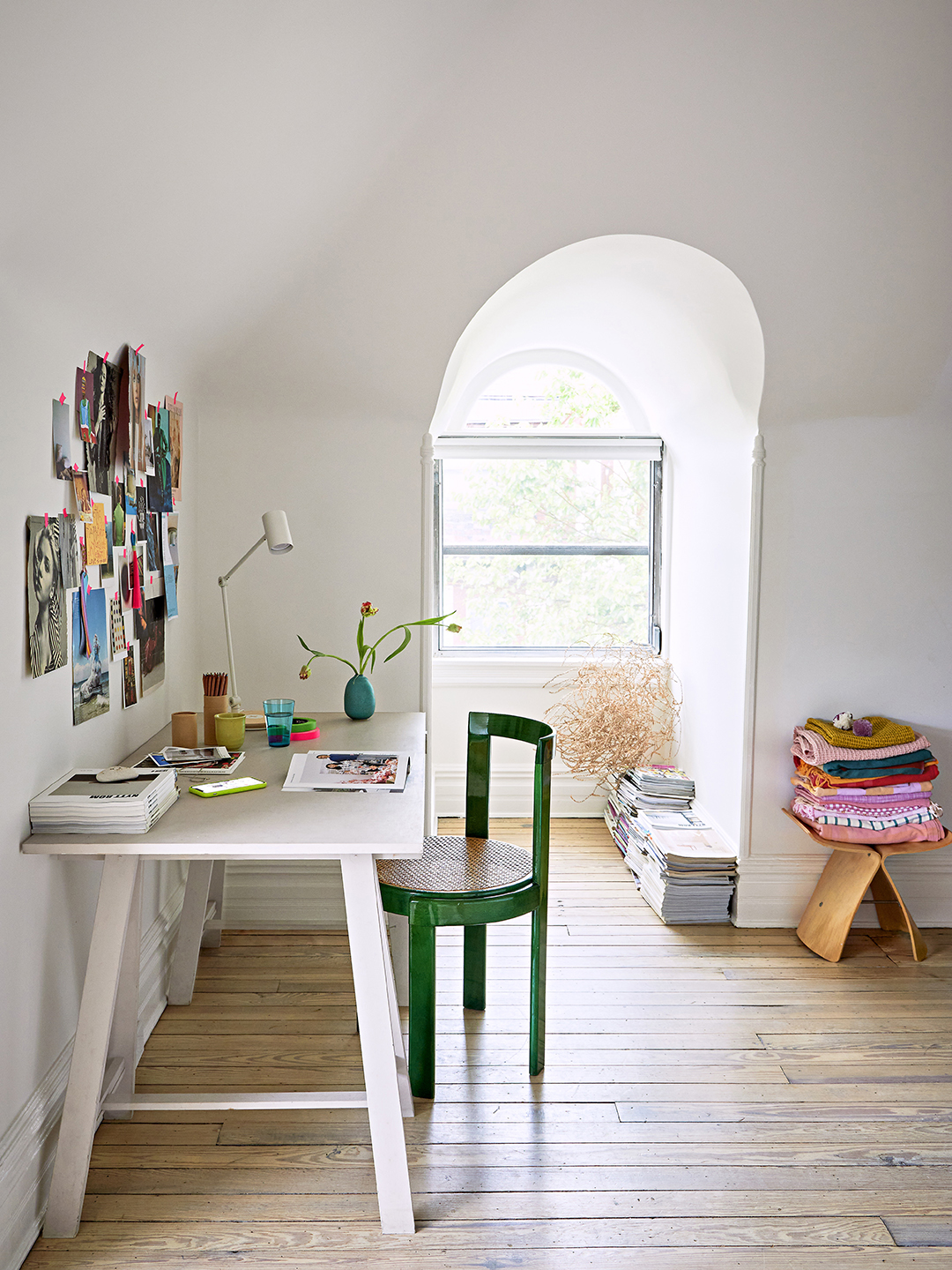 While Glatved has a similar collage brewing up on one of the walls in her third-floor office, she hasn’t been as quick to decorate their bedroom. Believe it or not: “It takes me a long time to commit to hanging anything on the wall,” she admits. For her, the windows offer enough interest. “It has the most beautiful light. It feels a little like a tree house when you’re up there,” she says.