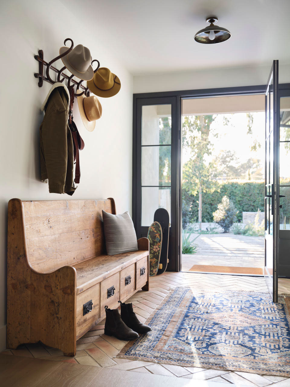 Telal Industrial Factory Flush Ceiling Light, Mullan Lighting; Vintage Rug; Artillo Spanish Cotto, Arto; Vintage Bench and Hook Rack.