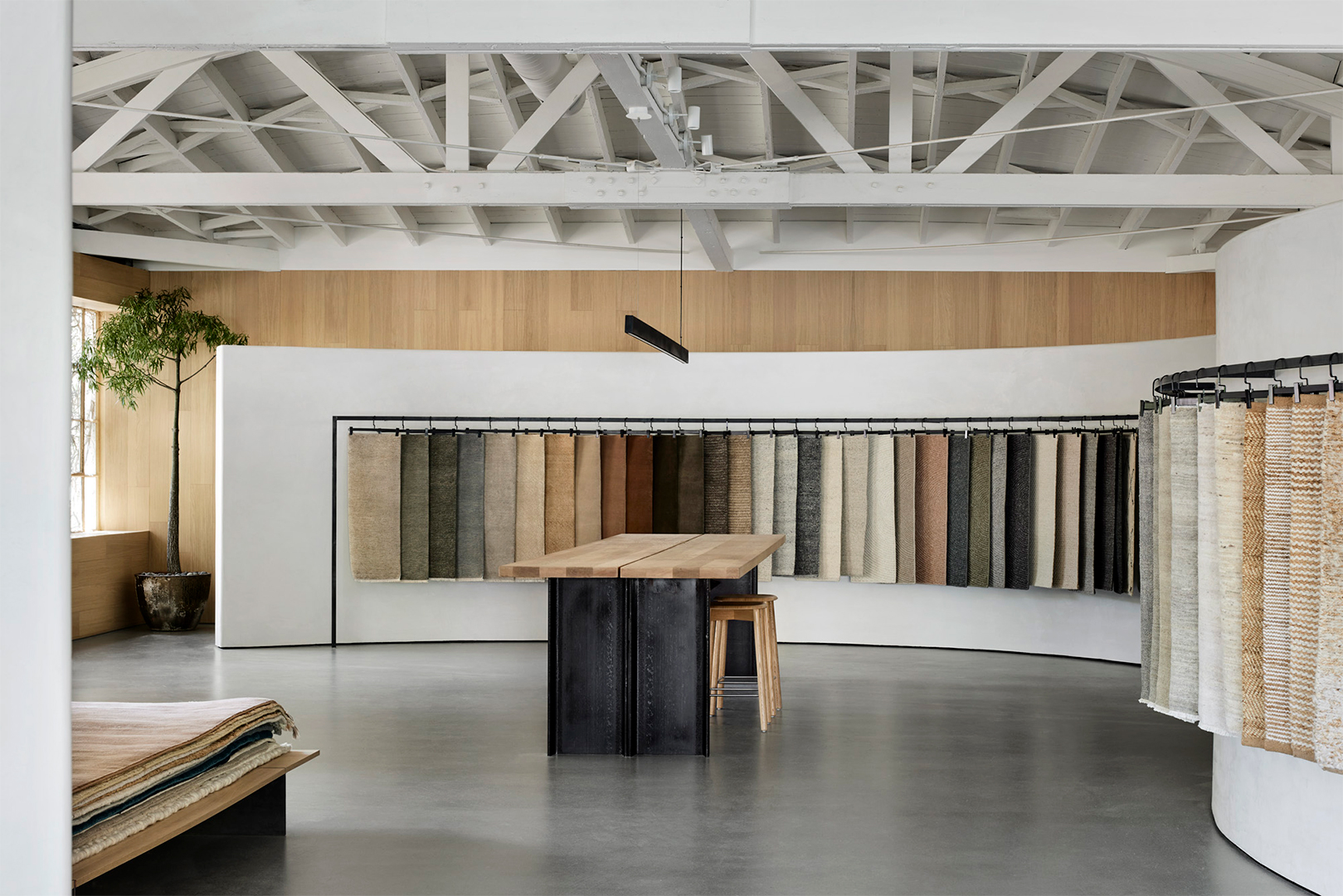 With its new Los Angeles showroom, Australian floor-covering brand Armadillo has come to the rescue via a sweeping space with a snaking partition that displays its dozens of eco-friendly offerings, from jutes that won’t shed to silk and wool weaves in calming sunset shades.