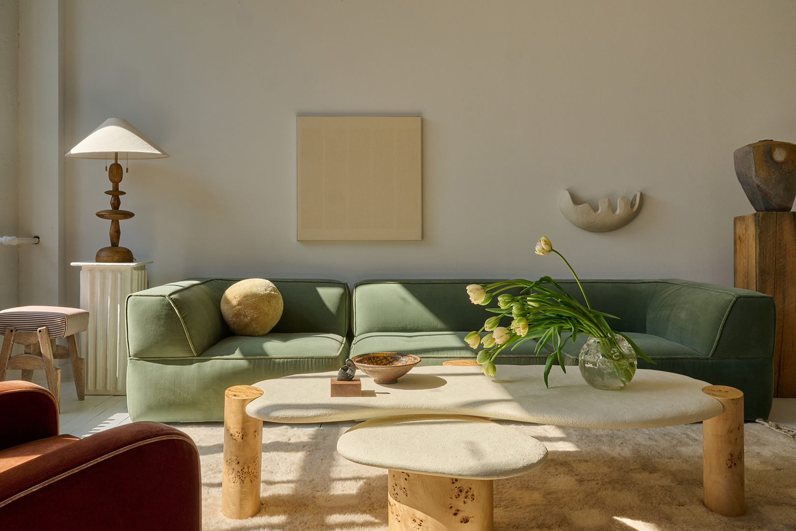 At 1,200 square feet, the winner was slightly larger than Calderone had initially envisioned, but it had a wall of windows facing the right direction and would allow the multihyphenate to carve out zones for the many sides of her business, from product development to interior design. Sold! Or, we should say, leased. It’s a rental, so Calderone would have to get creative to make the concrete ceiling, exposed pipes, and bright white walls work without any permanent changes. “The home is at the crux of everything I do; I wanted the space to feel homey,” she explains. Here’s how she did it.