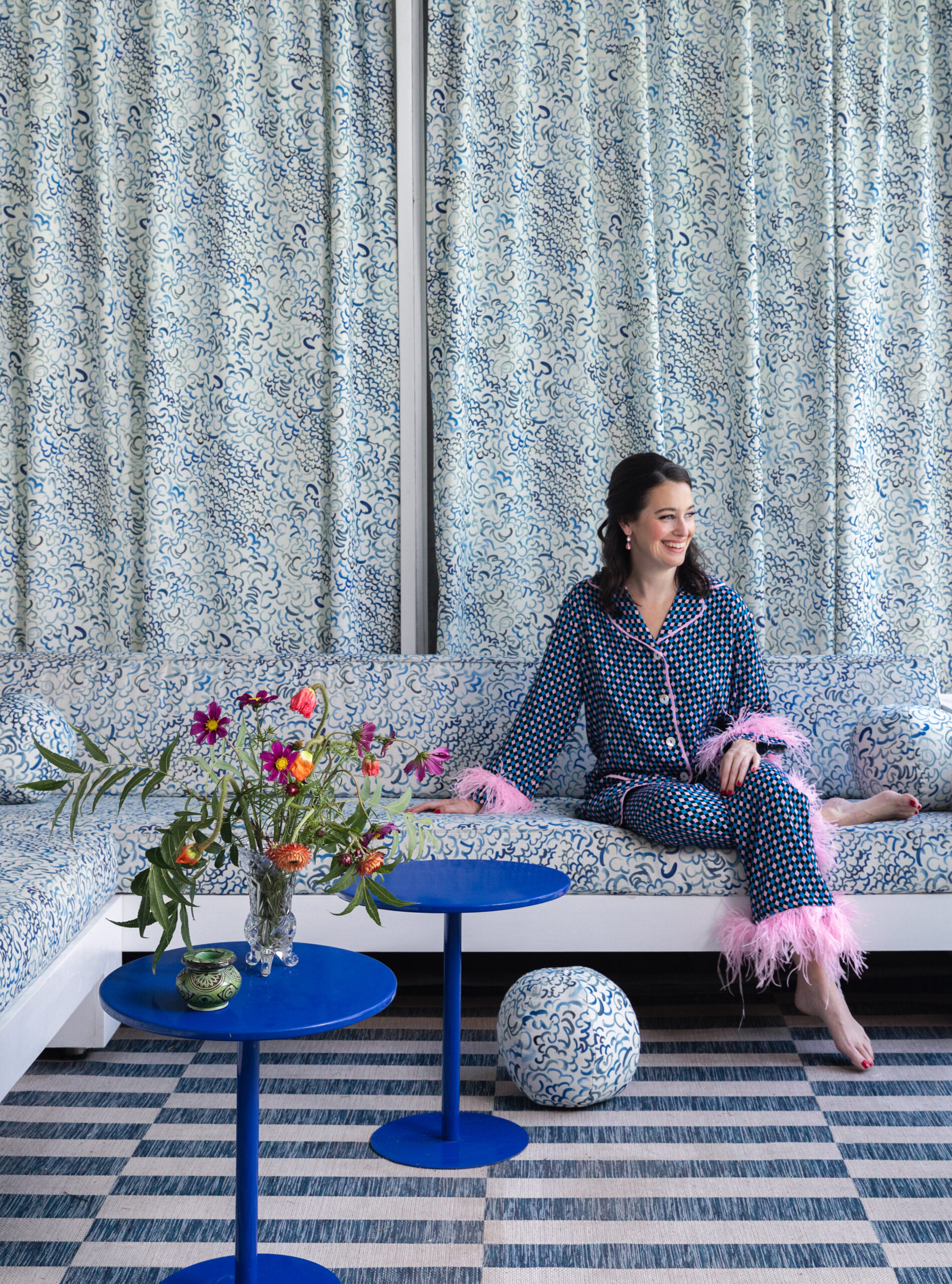 Even the sofa on the screened-in porch is covered in a whimsical print, except this one is both patterned and performance. “It can hold up to the wind and rain, all of it,” notes West. The cloud-inspired illustration was a fitting choice for being right next to the pool, plus West and her husband are suckers for blue and white.
