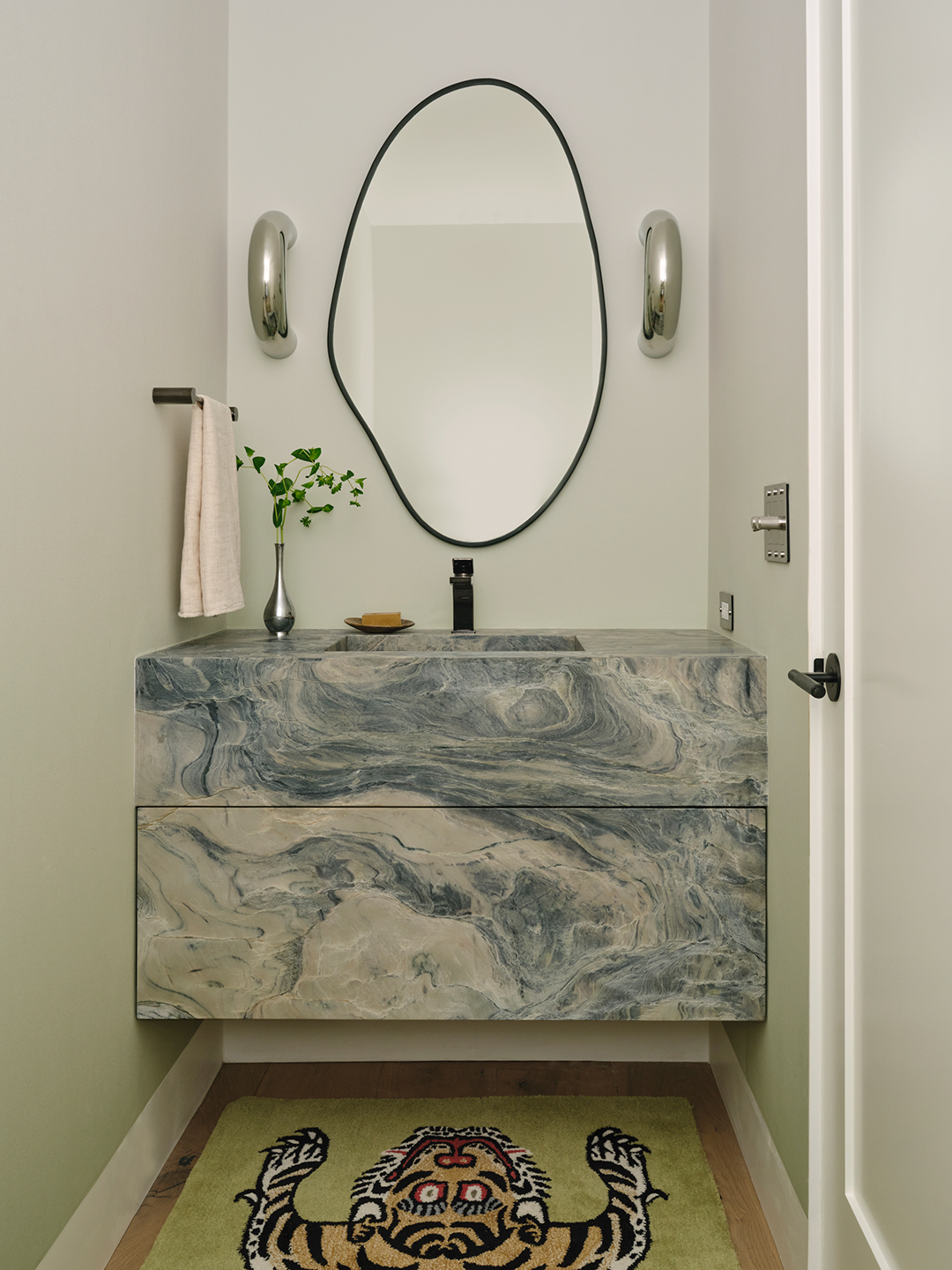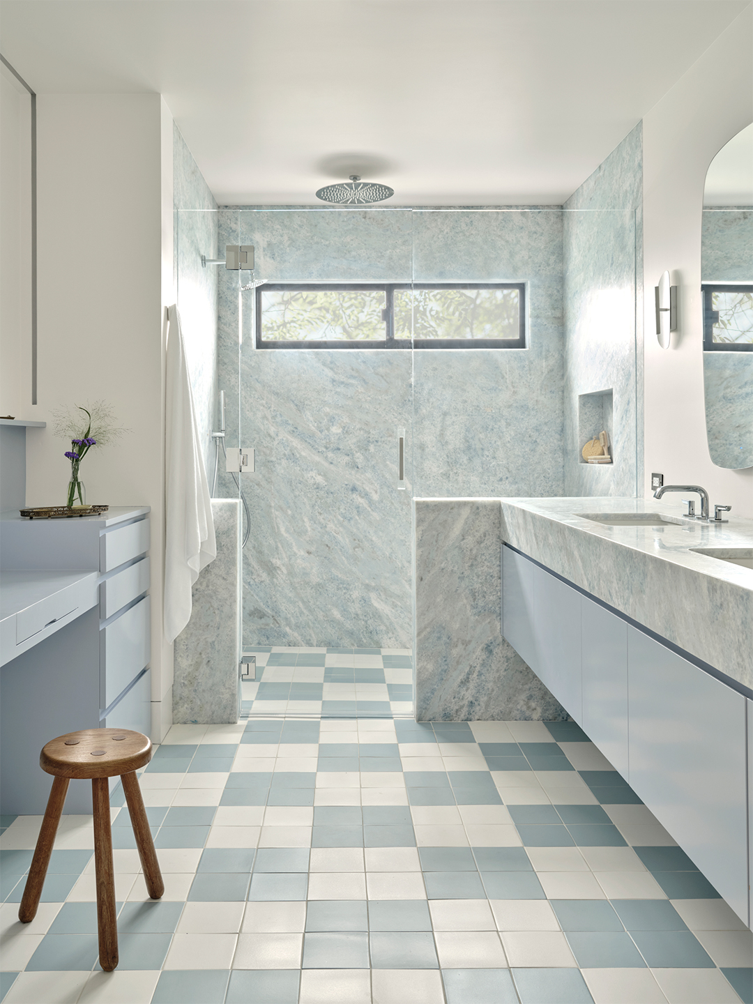 “We will go to 20 stone yards to find a slab that gives us the feeling we’re after,” says designer Katelyn Pascavis, who cofounded Two Muse Studios alongside Alexa Lameiras back in 2019. While renovating a Pacific Palisades home with ocean views for their latest clients, a retired couple looking to put down roots in Los Angeles after years of living in Milan, the vibe was all about cool, blue-tinged surfaces: a bar backed by honed emerald quartzite, a kitchen island wrapped in swirly Arabescato Arni, and a shower framed with iceberg blue marble. “This house could handle some real personality,” notes Lameiras. Mainly, that’s because the space as is was completely lacking in it.
