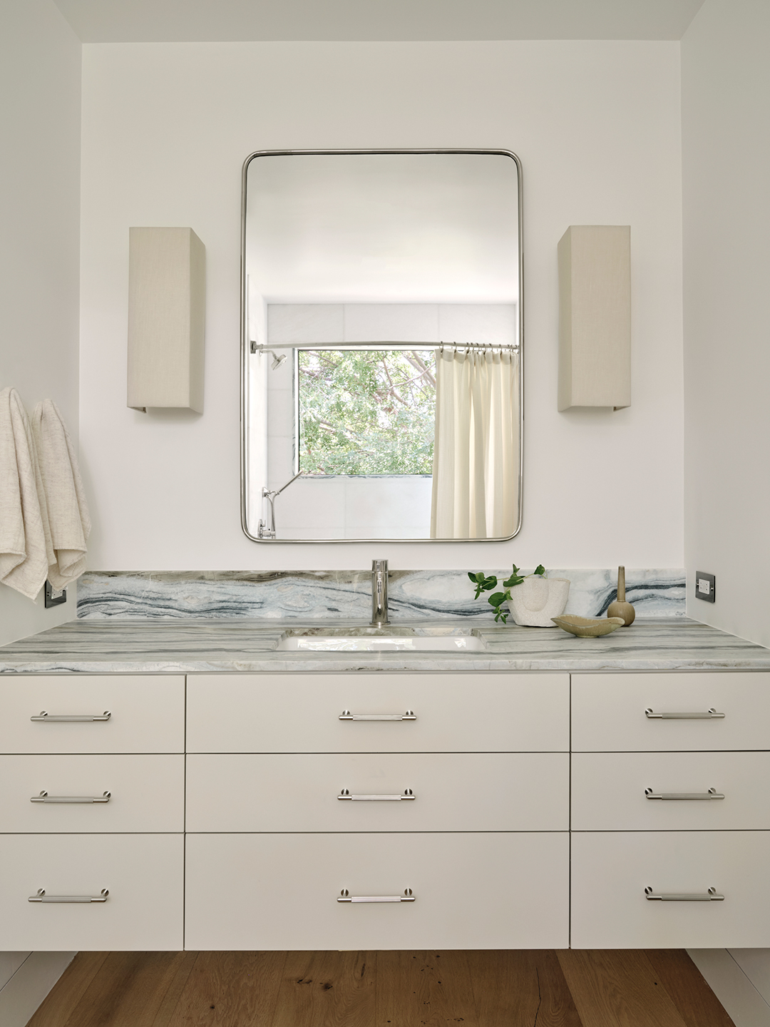 Lameiras: We wanted to do natural wood cabinets in the primary bathroom to bring some warmth into the space, but the husband was adamant about painting the vanities blue. They told us, “Let’s go for it!”