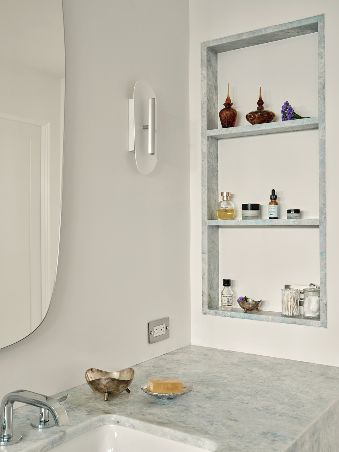Lameiras: We had some leftover iceberg blue marble, and because our clients were hungry for extra storage, we used the scrap stone to line an open shelving niche next to the vanity. We added an outlet within the nook, that way the wife can plug in her electric toothbrush while keeping the countertop clear.