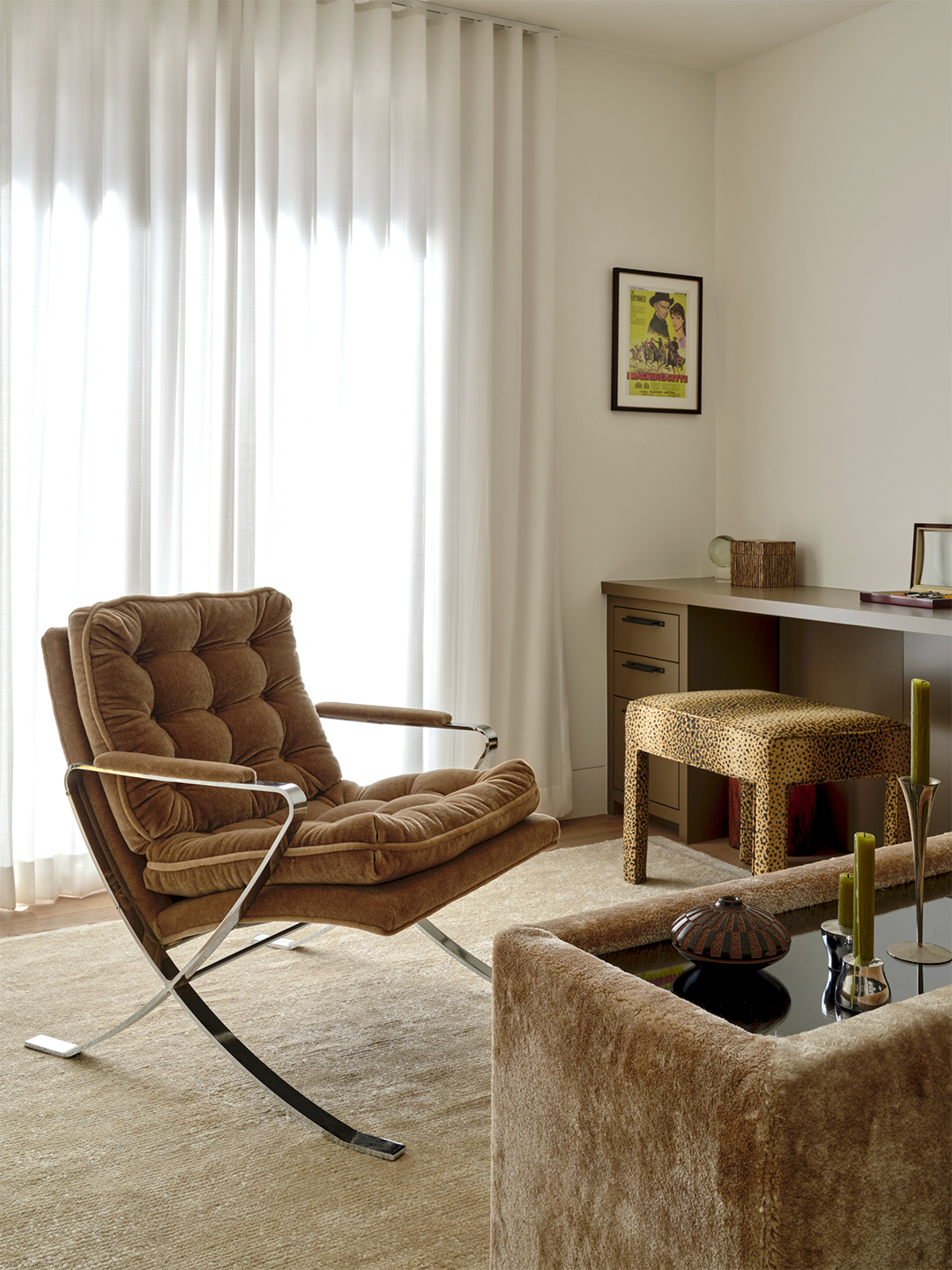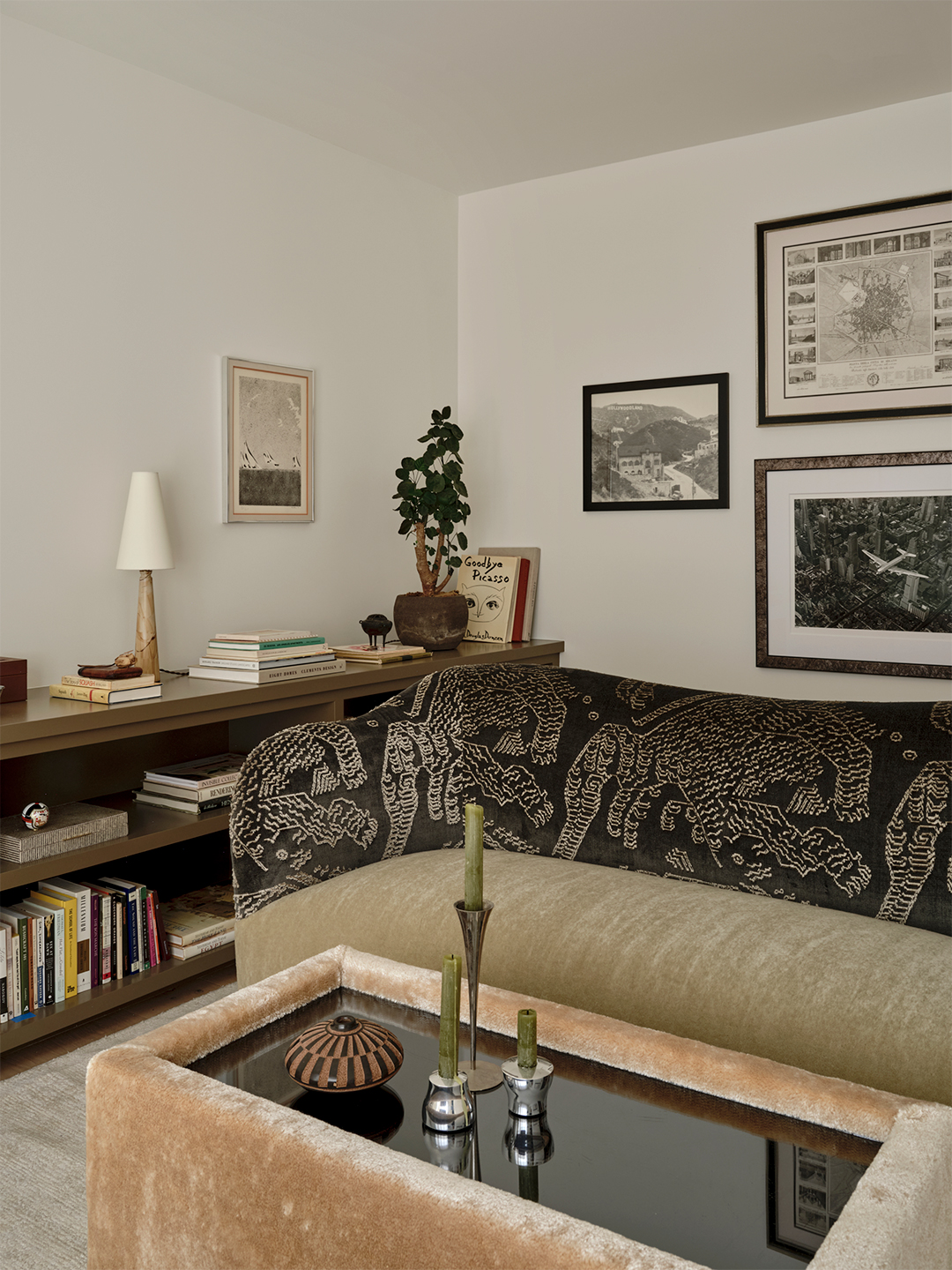 The house had been previously stripped of its mid-century charm: The cabinets in the kitchen were a snoozy white; part of the property had been converted into an in-laws suite; and built-in storage was few and far between. “It was mid-flip (and the very do-it-yourself type) when they bought it,” recalls Lameiras. The couple specifically asked the designers for “fun,” feeling heavily inspired by the rich velvet fabrics and glitzy metal lighting they’d grown accustomed to seeing in Italy. Lameiras and Pascavis gutted the in-laws suite and put a gym, bathroom, art studio, and bedroom in its place; introduced peekaboo moments in once-awkward pass-through spaces (like the hallway–turned–watering hole); and tucked clutter away behind mysterious doors. Ahead, in their own words, Lameiras and Pascavis reveal this home’s best-kept secrets.