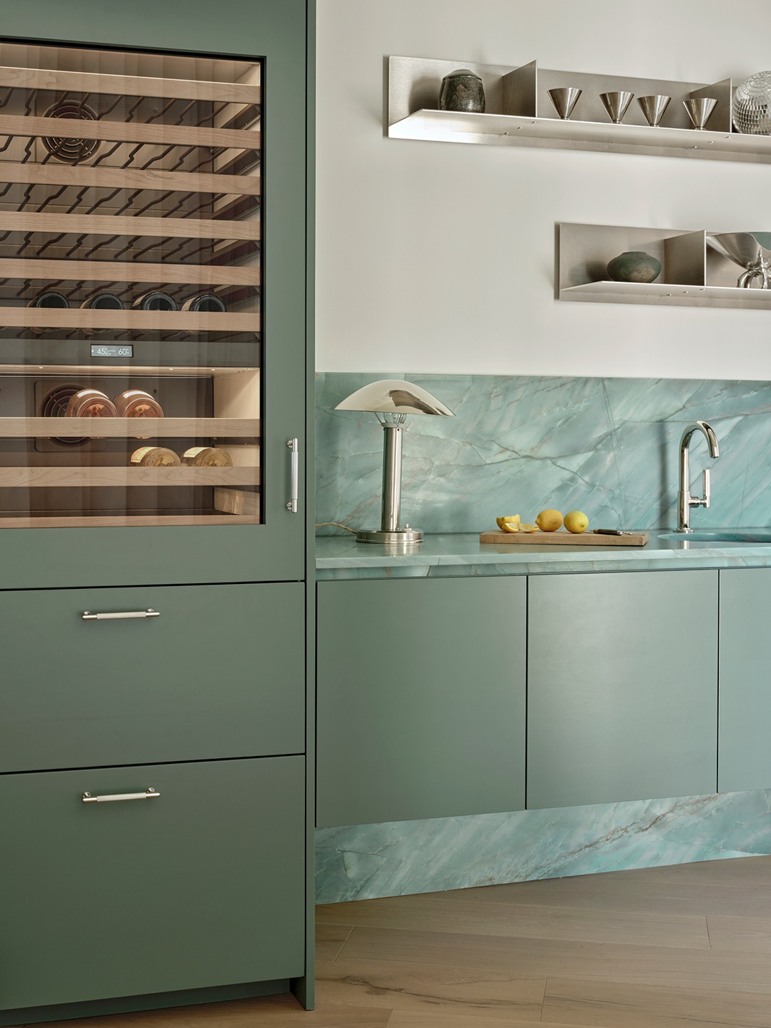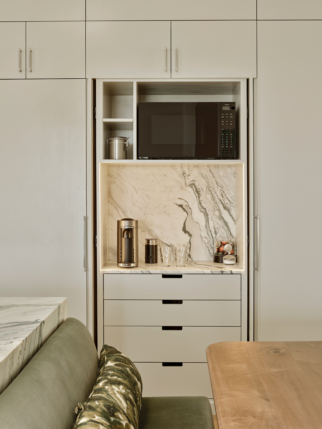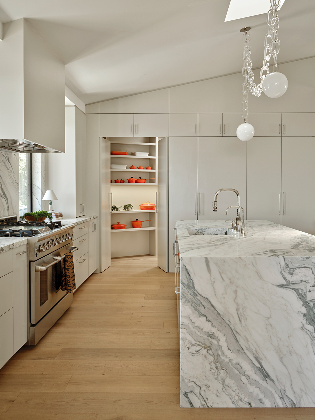 Lameiras: I’m obsessed with hidden things in kitchens—even whole pantries. We snuck this one in next to the refrigerator. You can walk in and close the doors behind you when you have company, that way friends don’t have to see your stuff at all times. We did open shelving within the pantry, so it’s easy to go in and grab things. Elsewhere, the integrated coffee bar is tucked away behind pocket doors.
