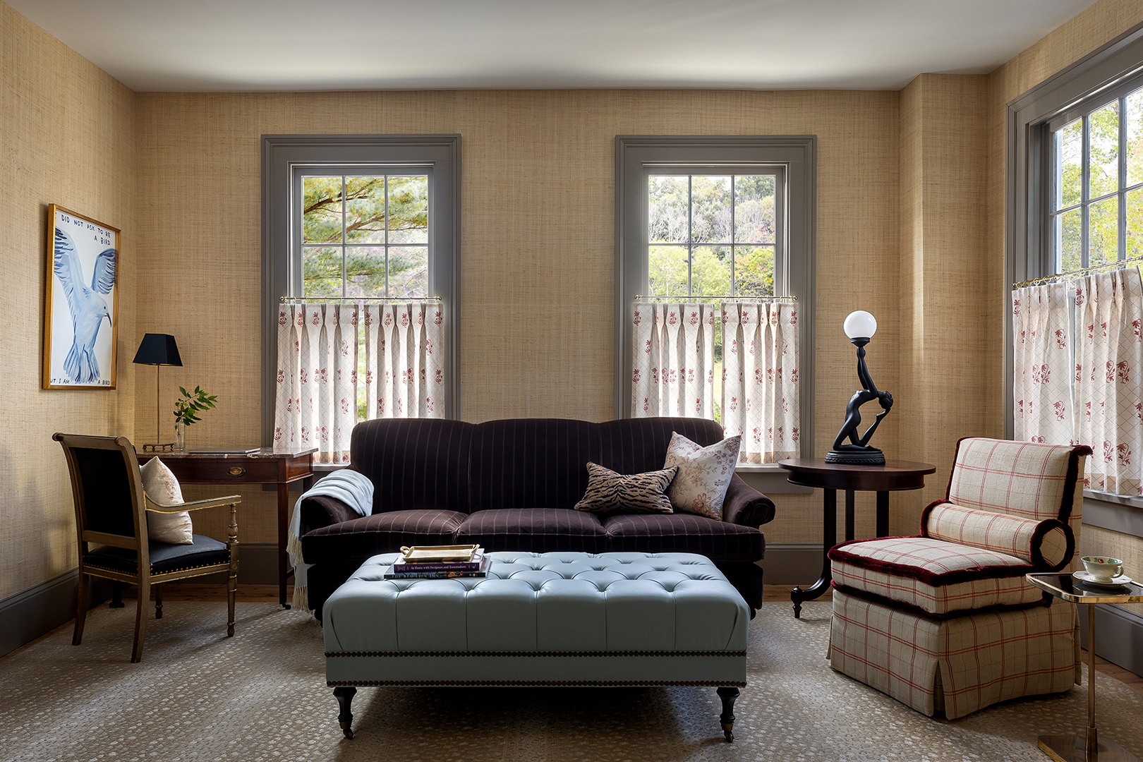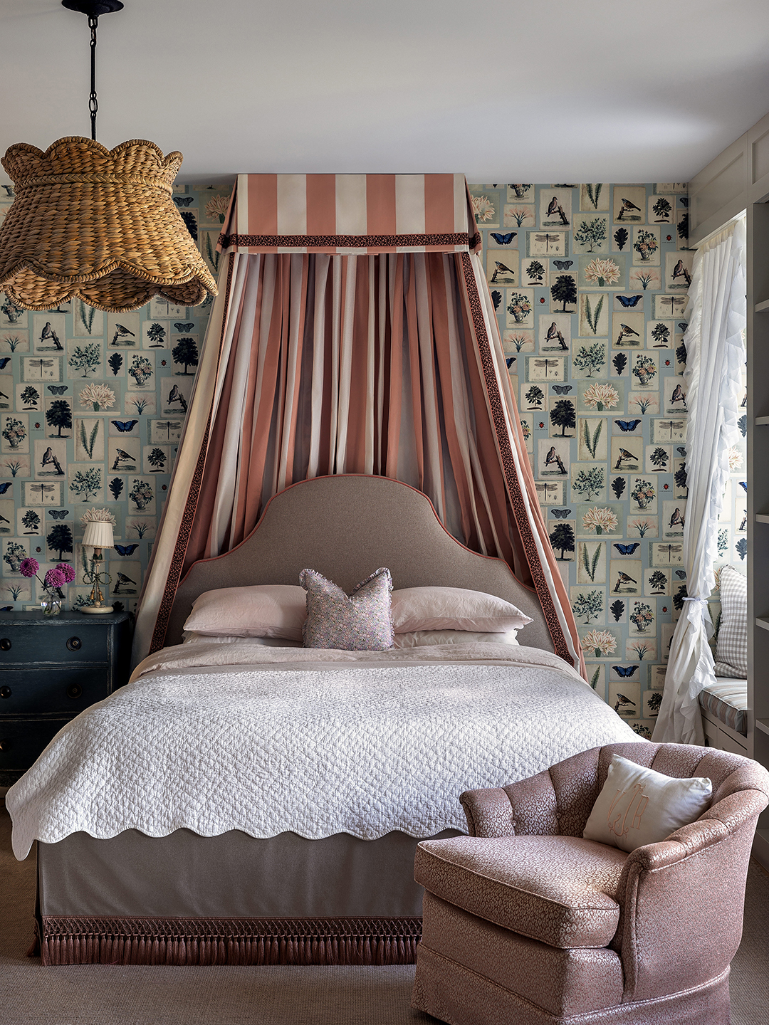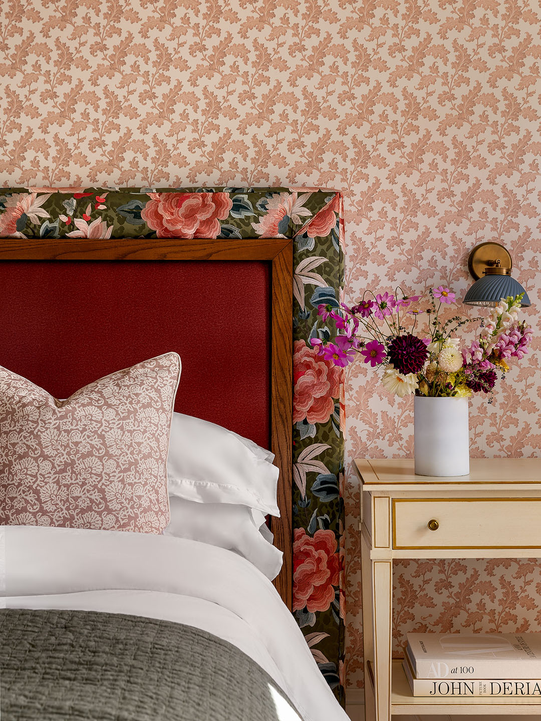 The biggest thing is that they all have a common color in mind. You can see that the cranberry color is the constant—there’s some in the bed, there’s some in the wallpaper, there’s some on that chair in the tassels. It’s pulled out throughout to make it make sense. Then there’s scale. You want some small, some big. The big, chunky floral that wraps the headboard is a Liberty fabric, and the wife freaked out because Liberty was her wedding dress designer, so she just fell in love with it. I like that the room feels like it could be a more modern version of like your grandmother’s house in the country.