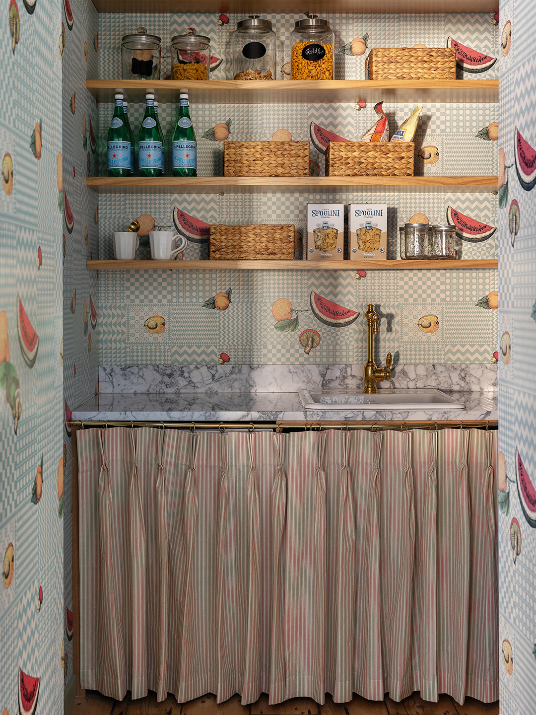 With a house like this, you can see everything from the front door, so keeping some spaces a little more private was pretty important. Also, the kids are also really young, so the parents liked the idea of separating a speakeasy. Plus, a hidden pantry is a great spot to put your mess when you’re entertaining. The rooms are cool, but they’re also very functional.
