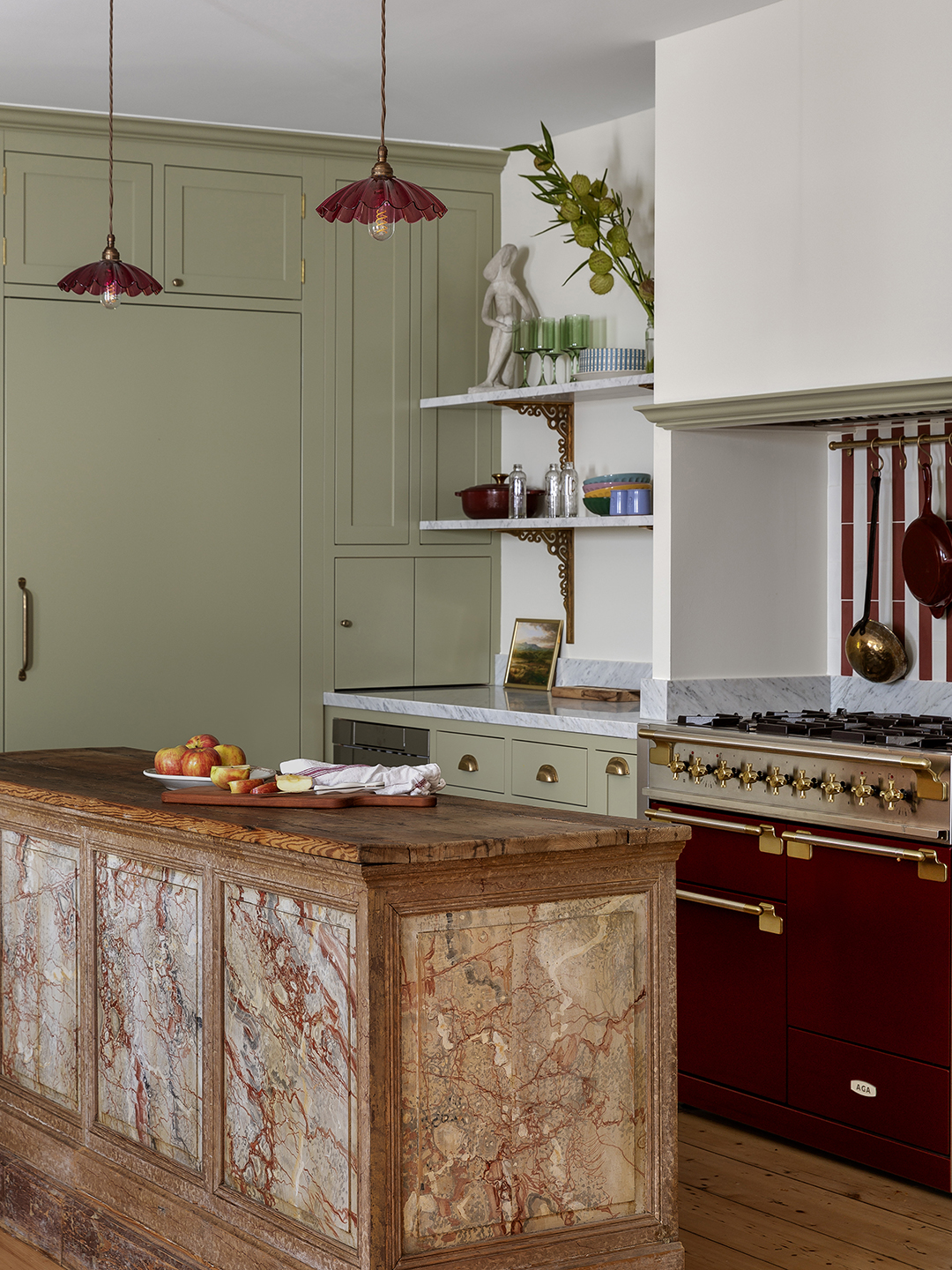 Yes! The second piece of this massive color puzzle—after deciding the palette—was finding the kitchen island. It came up on one of my searches on 1stDibs, and I knew we had to have it. It took the colors tied so nicely with the wallpaper, and set the tone for the rest of the kitchen. The island was a one-off find that kept building this project to be over-the-top but still inviting and warm. It’s so layered, which is something I really strive for. I don’t want things to feel too new or too precious. I want them to feel collected over time.