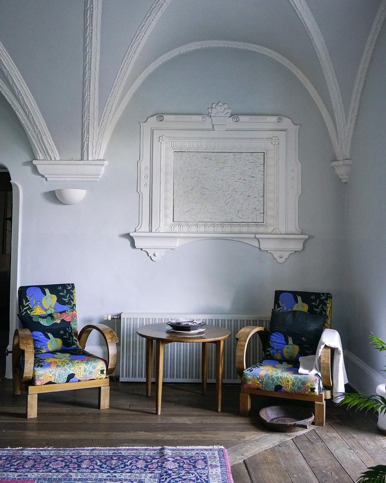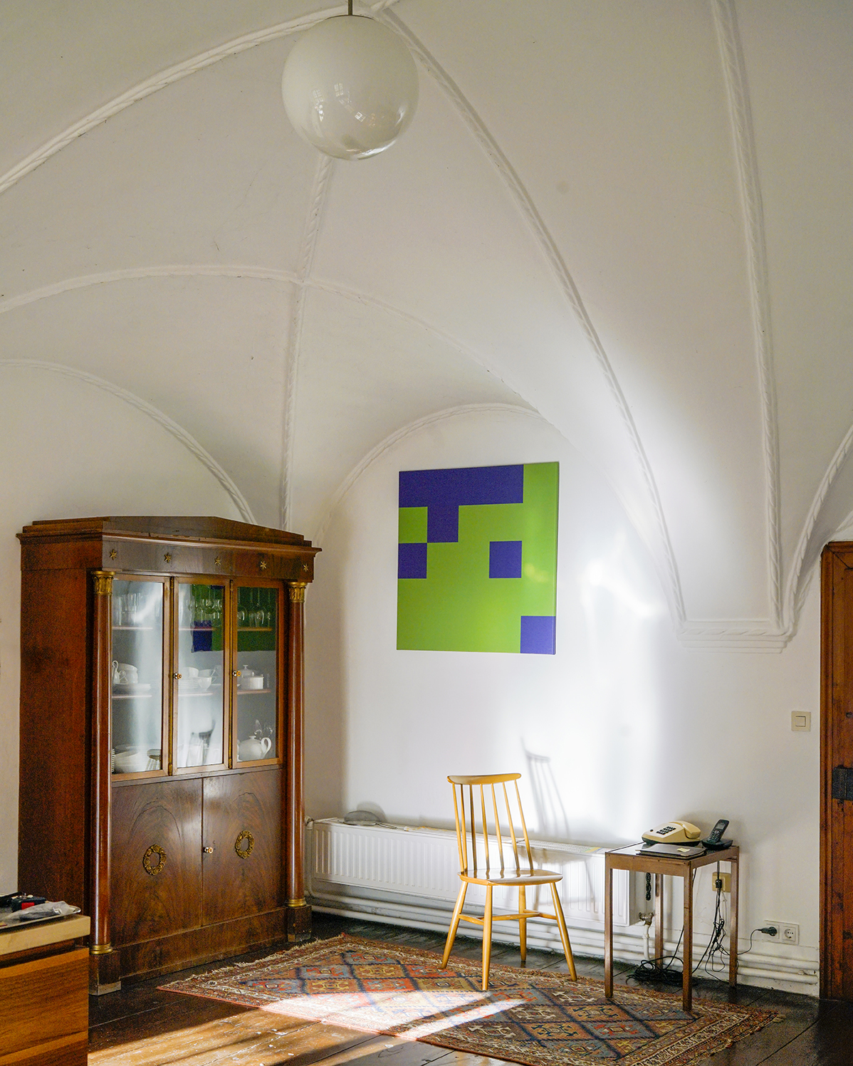 A handful of the installations directly involved the architecture, like the magenta-painted entrance hall designed by local artist Oskar Putz in 2006. “It radically changed the space and its atmosphere,” says Gertraud. Their dining room, on the other hand, was a dusty blue hue when they moved in and still is today. The couple only touched the lighting (they purchased the extra-long chandelier 40 years ago) and furniture. “When we took over the castle, it was completely empty,” recalls Gertraud. “That was good for us, because what would we have done with Baroque furniture?”