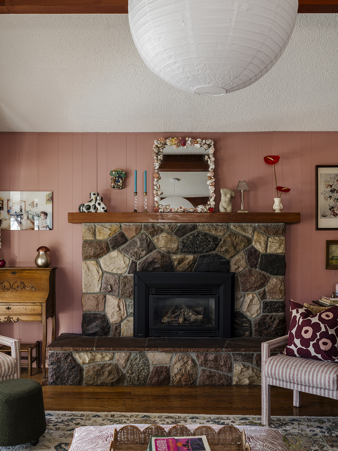 When the designer learned that their landlord’s only two renovation conditions were to avoid purple or black paint, she began scouring fan decks. The aforementioned terrazzo tile sent her down a pink spiral. She began with Benjamin Moore’s Rosedale on the wall paneling, and painted everything above the molding a slightly lighter hue called Soulmate.