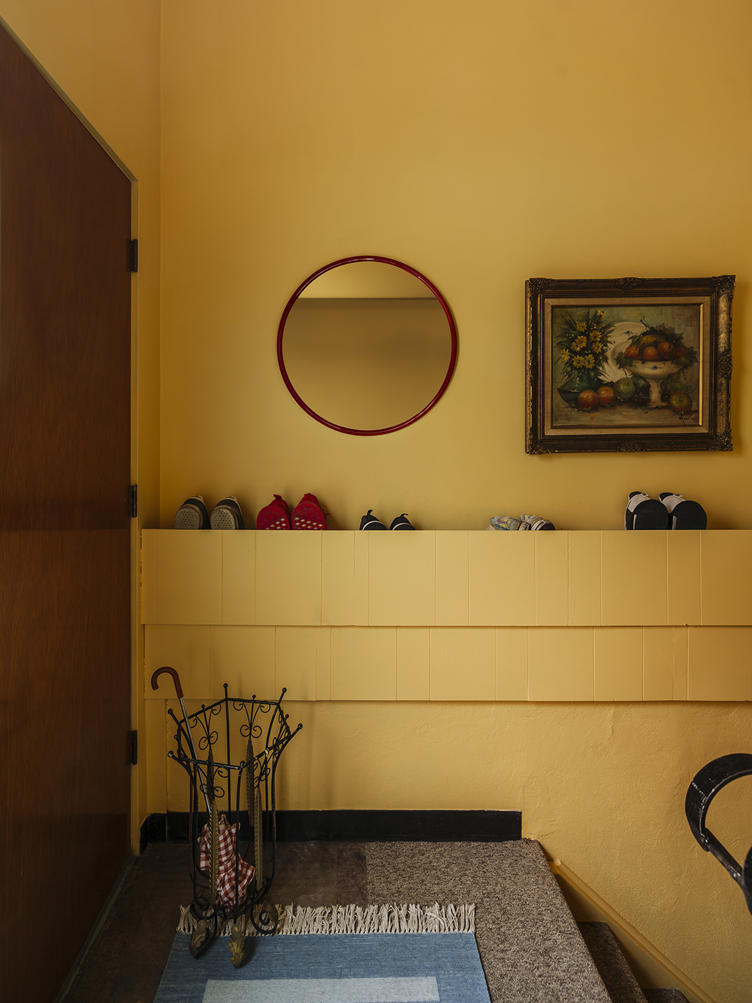 She also made coat drop-offs a little more fun by swathing the mudroom in Farrow & Ball’s Citron, a job she tackled herself between nap times with an extension pole and a lot of patience. Around every corner there are clever built-in nooks and crannies—Collins suspects the original homeowner was a millworker—like the shoe cubby that lines the wall leading to the basement.