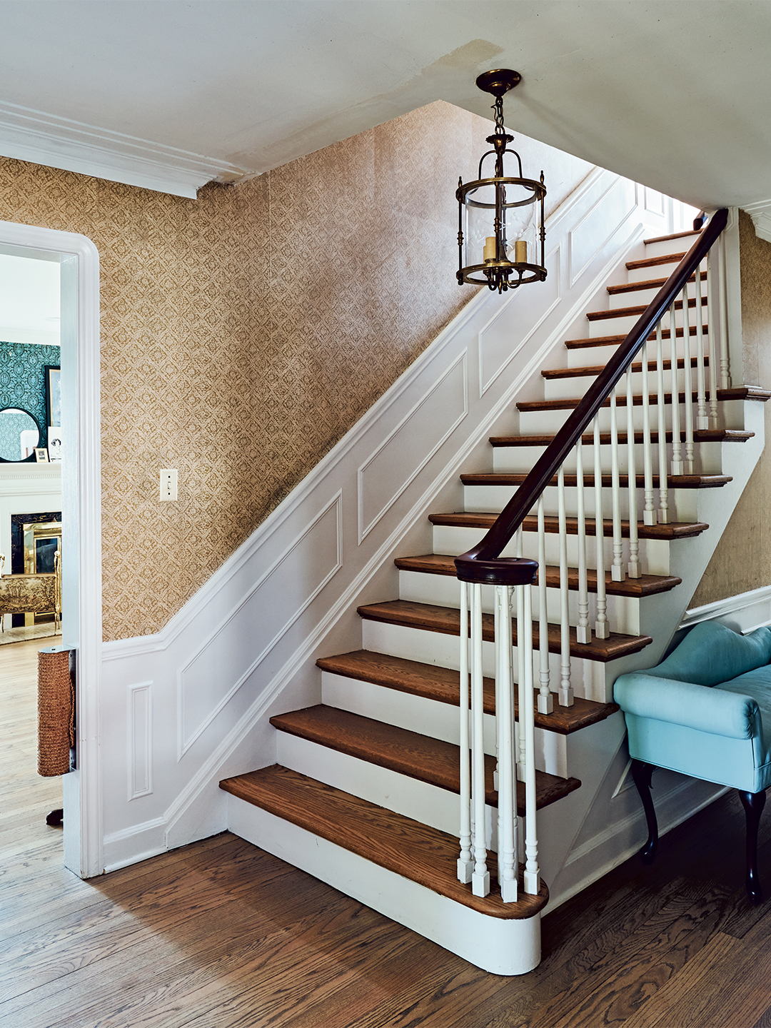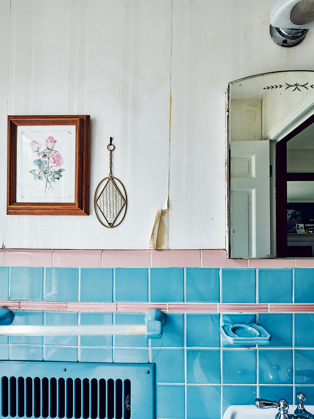 Throughout, there are details large and small with throwback vibes: the original built-in vanity station in one bathroom with circular salmon-colored floor tiles, the curlicue newel post, the patchwork of parallelogram tiles in the entryway, and the genuine oversize doorbell chimes hanging in the hallway, awaiting repair.