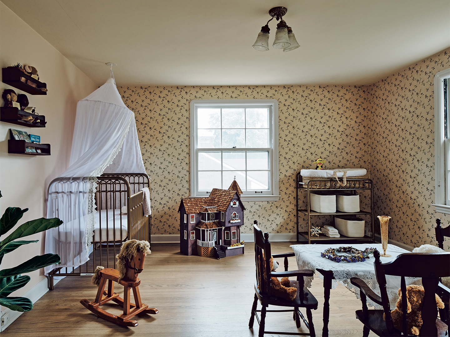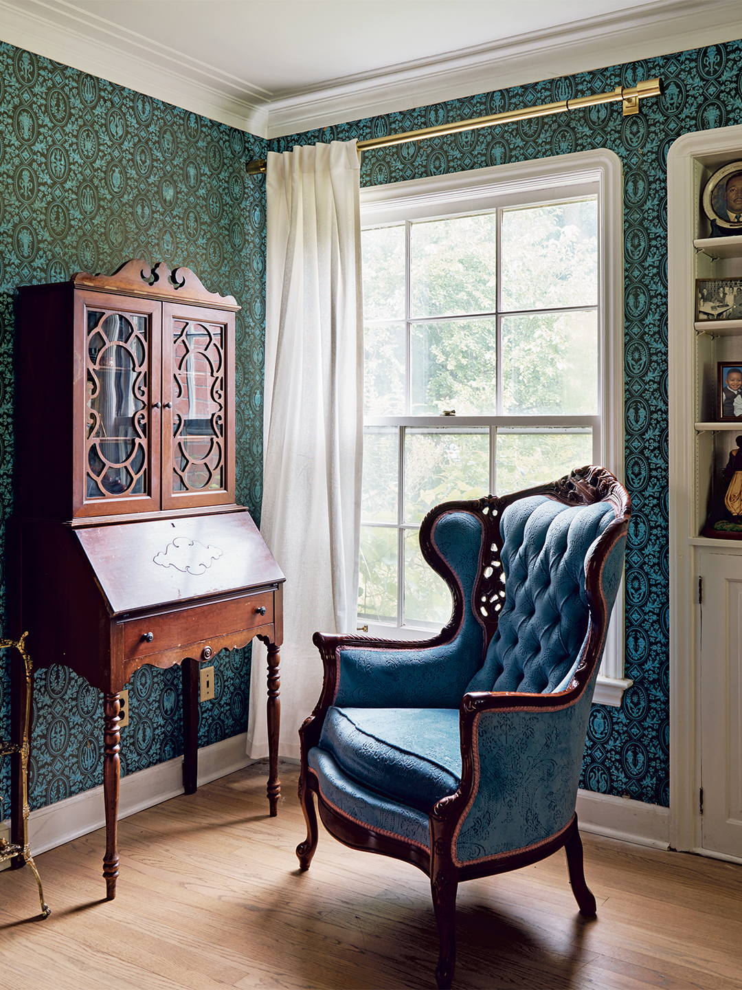 And then there’s the open-ended display of vintage wallpaper. In the dining room, there’s an embossed square pattern in a muted shade of pink. The foyer has a pattern of beige-colored rosebuds tucked inside gold diamonds. In Cozi’s room, a dainty vine pattern with green tendrils cursives across a cream-colored background. The belle of it all is the bold green and turquoise cameo pattern splayed across the living room, equal parts grounding and explosive with color.