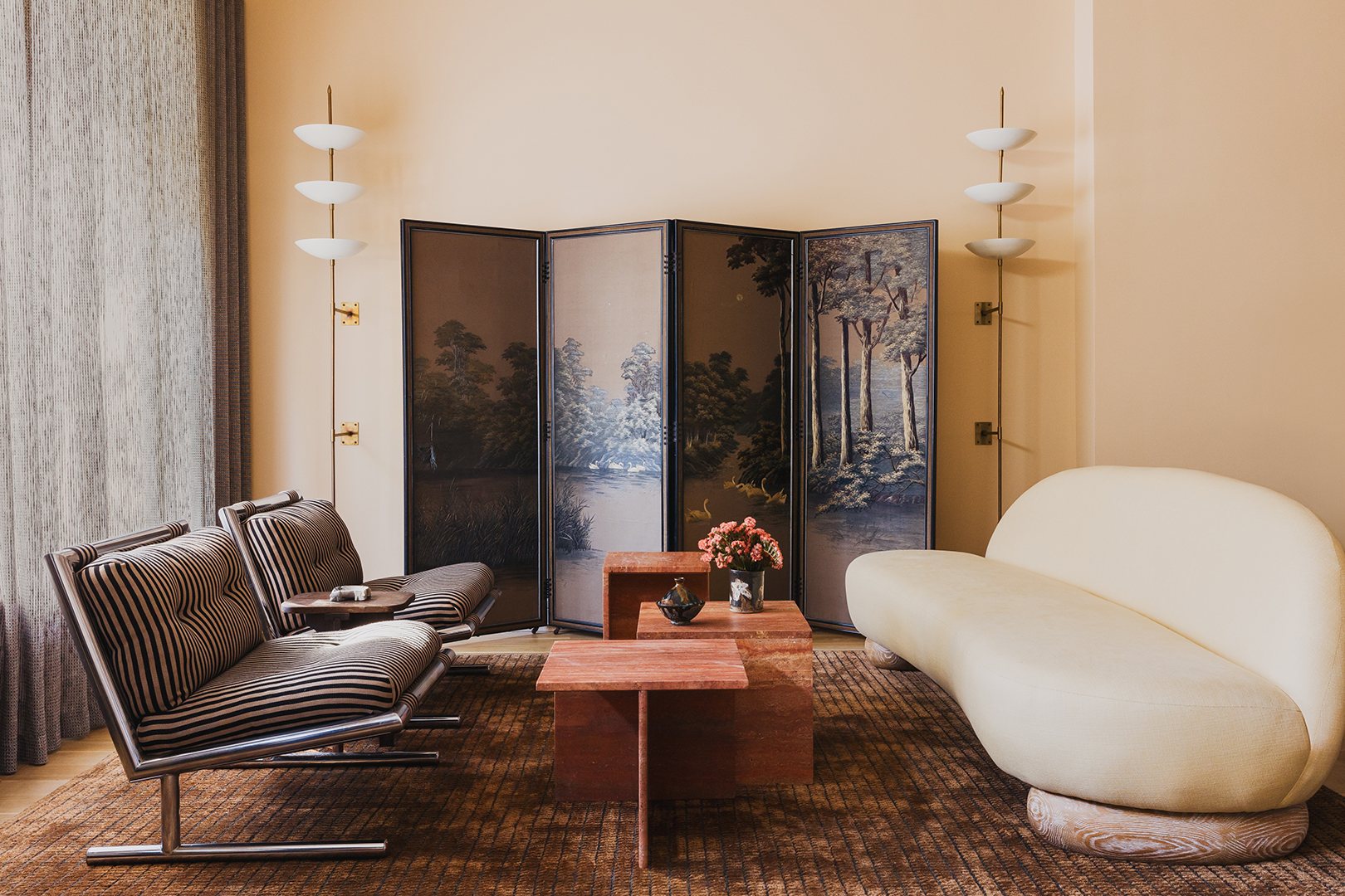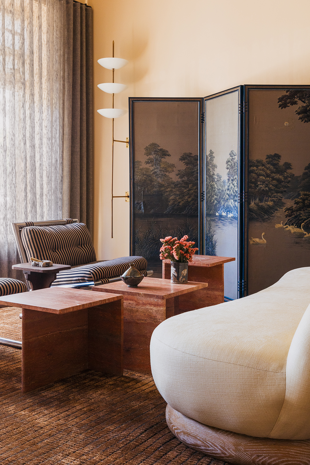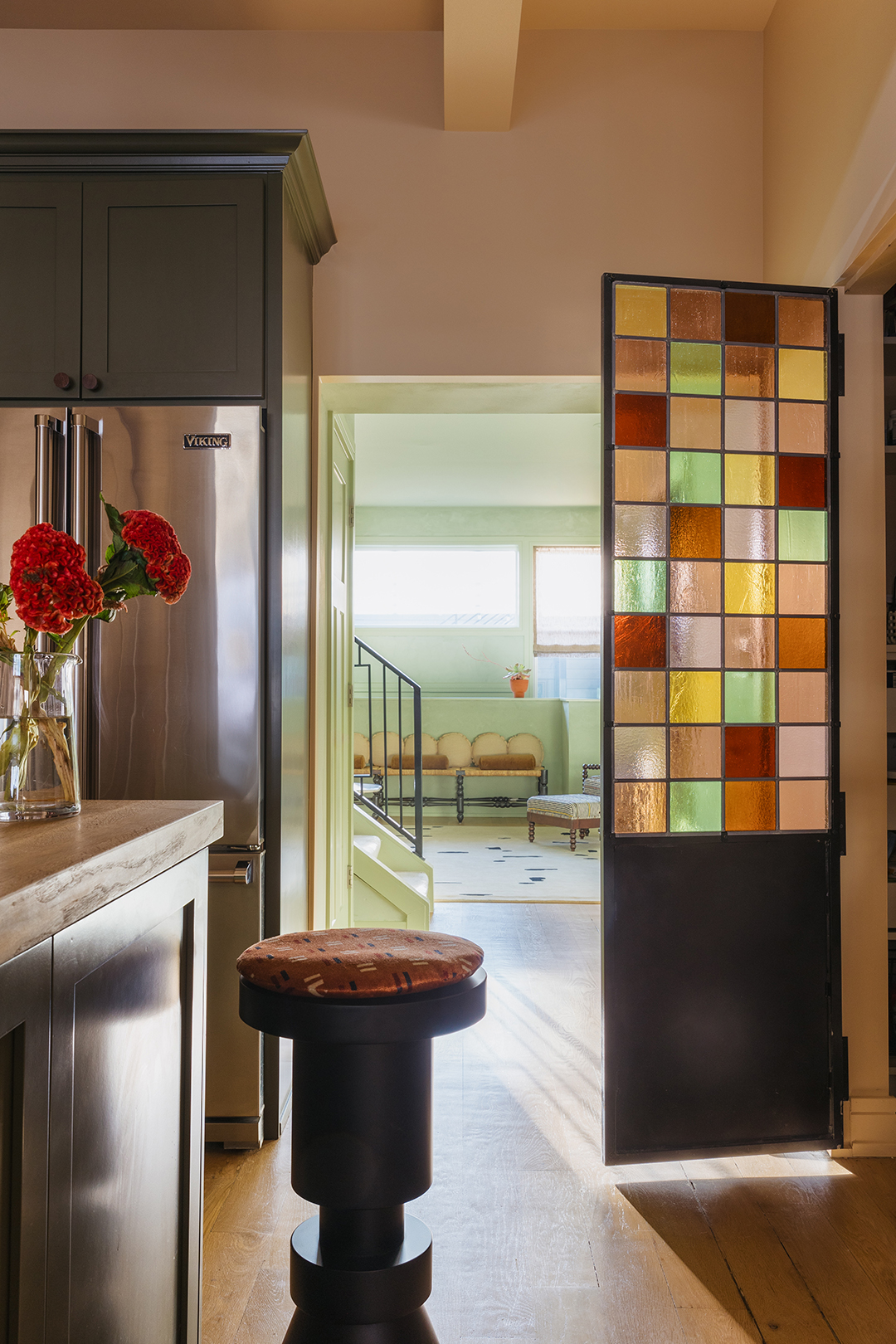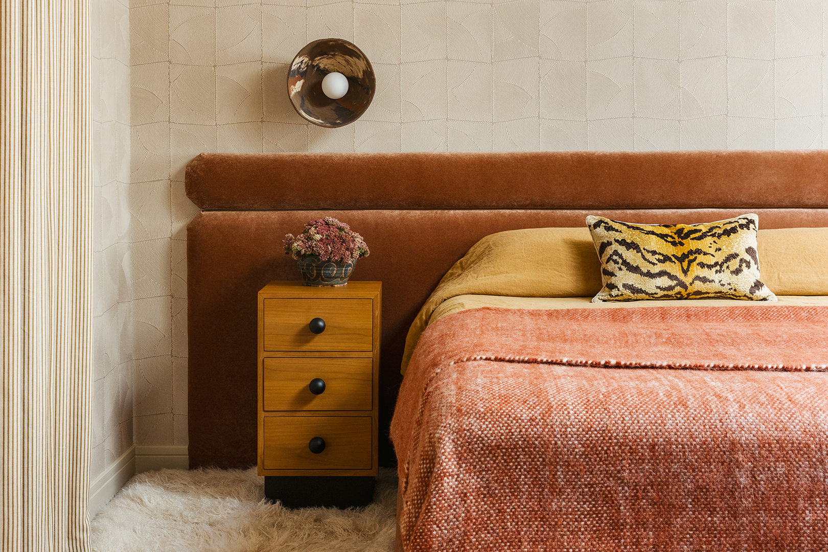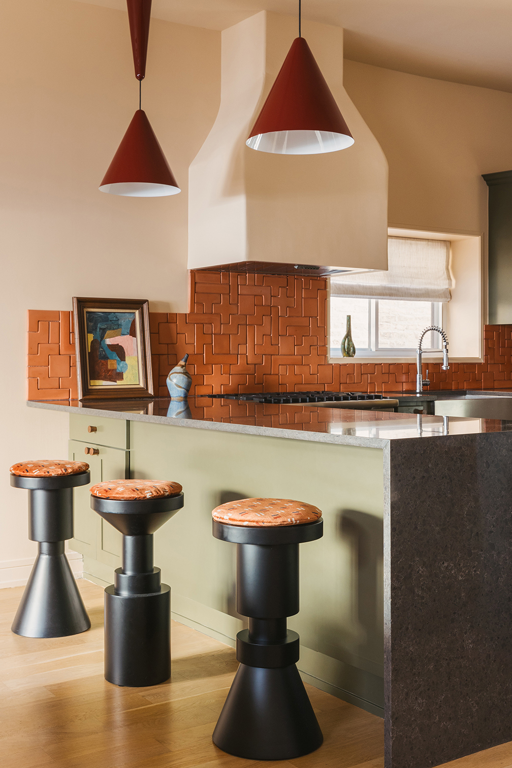 Sucher had chic, purpose-driven pieces custom designed, like a headboard swathed in sumptuous faux mohair to conceal the primary bedroom’s adjustable mattress. She amped up the intrigue with an eye-catching mix of angular and curvaceous pieces—a trio of mismatched geometric bar stools beneath a pair of red conical pendants in the kitchen is exhibit A.