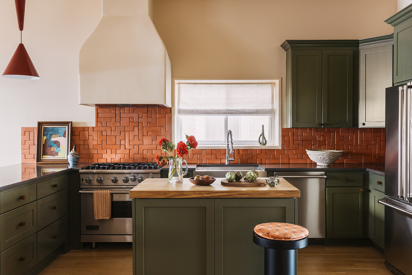 We looked at zellige tiles for the kitchen backsplash, but wanted something even more organic and unexpected. When I saw the terra-cotta tile at The Fine Line Tile, I knew it was it. Terra-cotta is naturally a bit imperfect—some pieces are pitted—and paired with the geometric shape of the collection, which is fittingly called Tetris, it was unique. We custom colored it to make it even richer and installed it haphazardly so there was no repetition.
