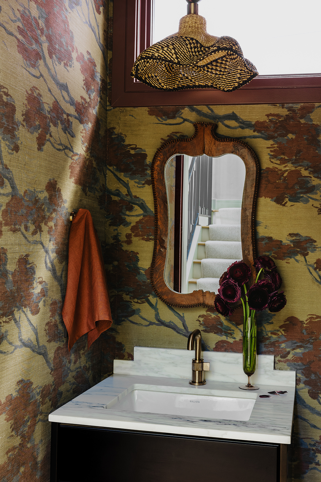 It is from Josh Green Design, and it just had all the right colors: the olive green from the kitchen cabinets, the burgundy from some of the art, and even a bit of blue. It also has a nod to the 20th-century Chinese screen in the parlor, which added a nice sense of continuity. Funny enough, when I showed it to the client, she later realized that a family member had almost the exact same pattern in their home growing up. That kind of thing can go either way, but in this case, she loved it—so it was definitely a win.