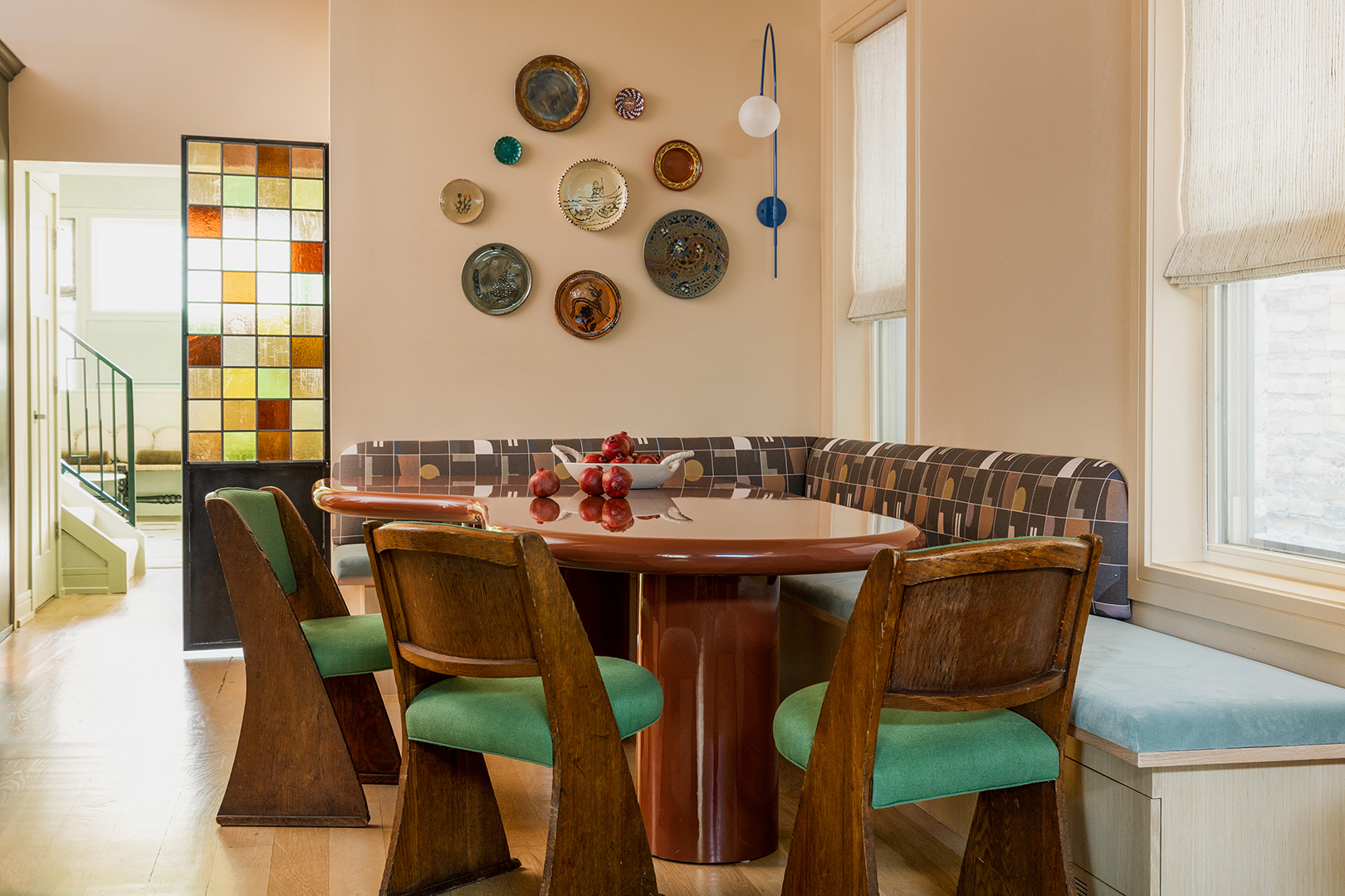 The three-bedroom brick home in Wicker Park, which the client shares with her husband, boasted good bones and an entertaining-friendly flow, with a cocktail hour–perfect parlor, sleek kitchen peninsula bar, cozy dining nook, and spacious living room. But its bland finishes and safe colors—white, gray, and navy blue—were at odds with the owner’s creative energy and desire for fresh, unique spaces.