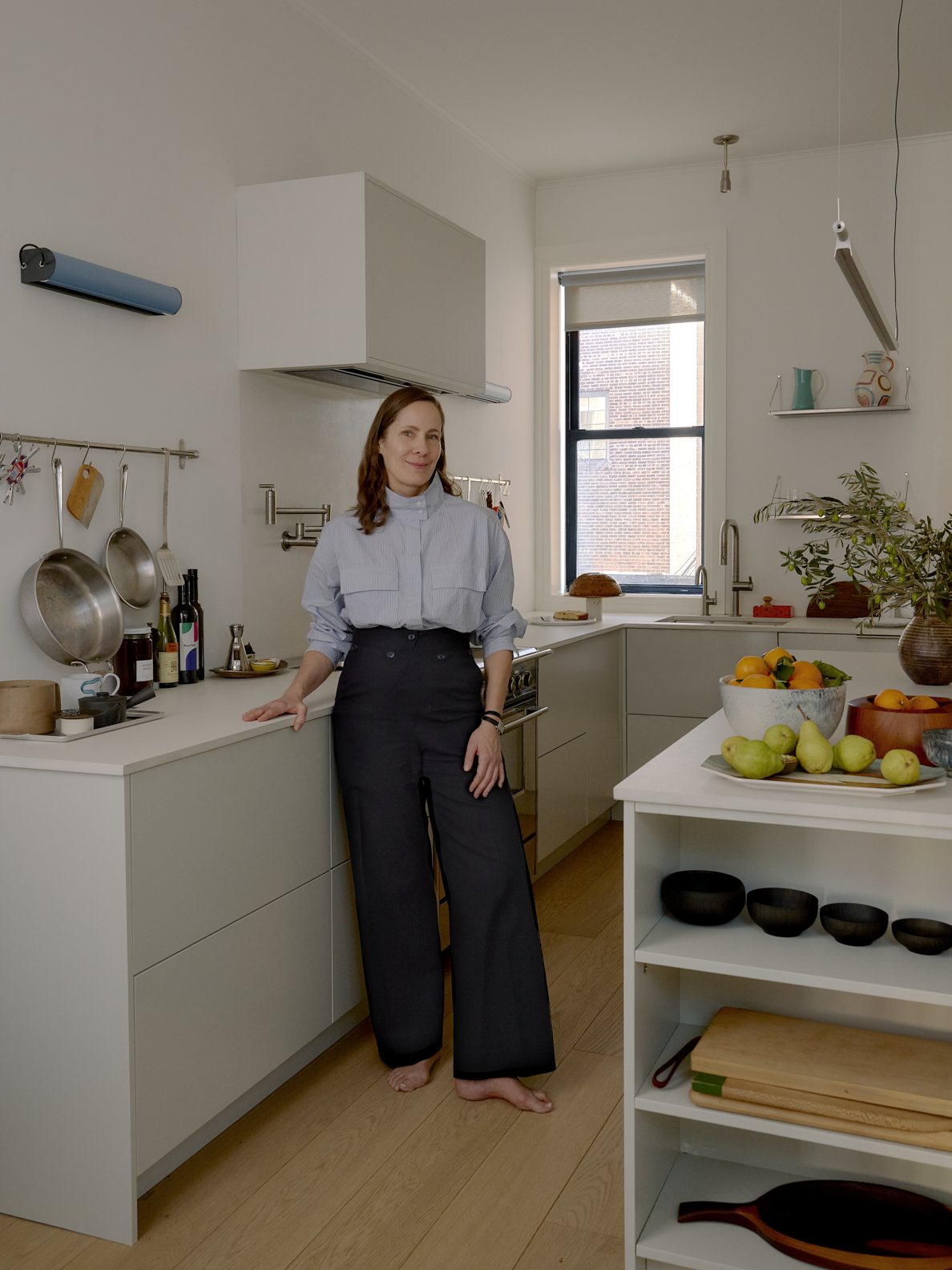 Muhlke invited me over for afternoon tea recently, and I marveled at how the apartment naturally unfurled as I moved through it. A tiled entry gives way immediately to the serene kitchen, clad in Muller Van Severen– and Inge Sempé–designed cabinetry that is home to Muhlke’s extensive collection of ceramics and cookware. As someone who writes cookbooks, runs a culinary consultancy, and helped the iconic kitchenware brand Dansk catalogue their archive, it’s not surprising that this room is where she spends most of her time. The Dekton countertops are indestructible, she notes, allowing Max to experiment with his own budding recipe development without fear of stains, and adding in the wall-mounted pot filler was just the right amount of luxury. In the evenings, she prepares dinner while her son does his homework or friends chat at the banquette nearby. (If she could do it over, she’d make room for a wine fridge.)