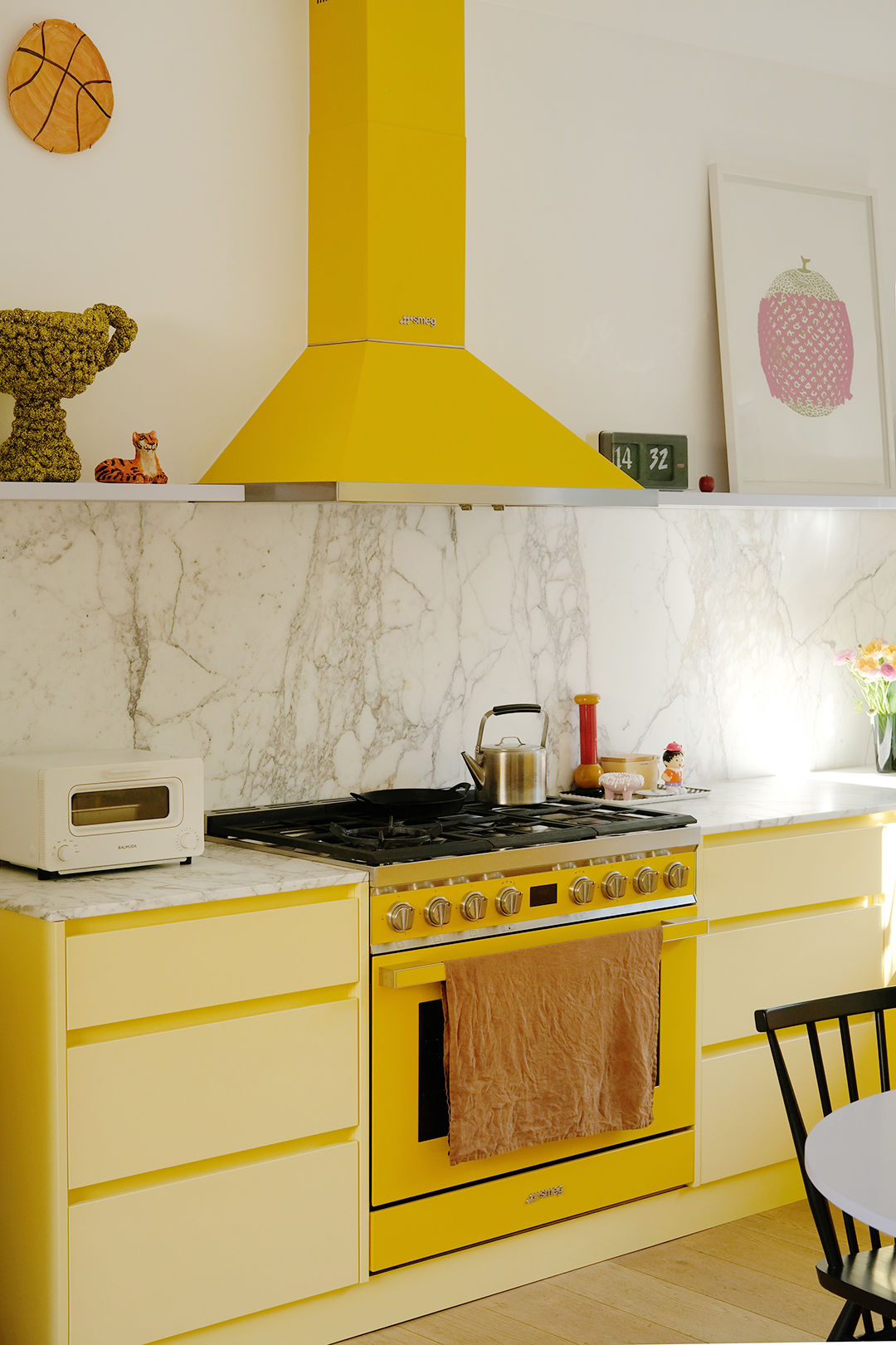 More recently, the designers finally got around to tackling the 30-year-old kitchen. Keeping the layout generally as is, they shifted the location of the range to make way for more counter space and went with a fresh color palette inspired by their days overseas. “Yellow is such a happy color and it’s a constant reminder of one of our great friends Thorsten van Elten’s lovely kitchen in his old flat in London, where we shared many fun times,” says Aiston.