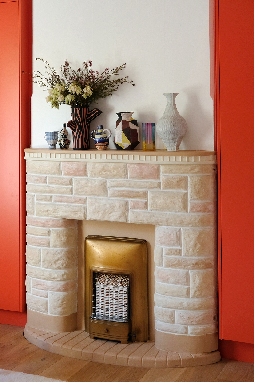 When the couple bought the property in 2009 after living in London for two years, their first task was removing all the asbestos and updating the bathroom’s poor drainage. From there, incorporating storage—with a dash of whimsy, of course—was a top priority. “We love having our stuff on show, but hate having a cluttered house that requires endless dusting,” says Aiston. In the guest space, two extra-tall cabinets in a poppy red hold their extensive book collection and frame a fireplace that the couple guesses was added in the 1950s. The surround is made entirely from plaster and painted to look like stone, “which gives it a real Disneyland feel,” says To.