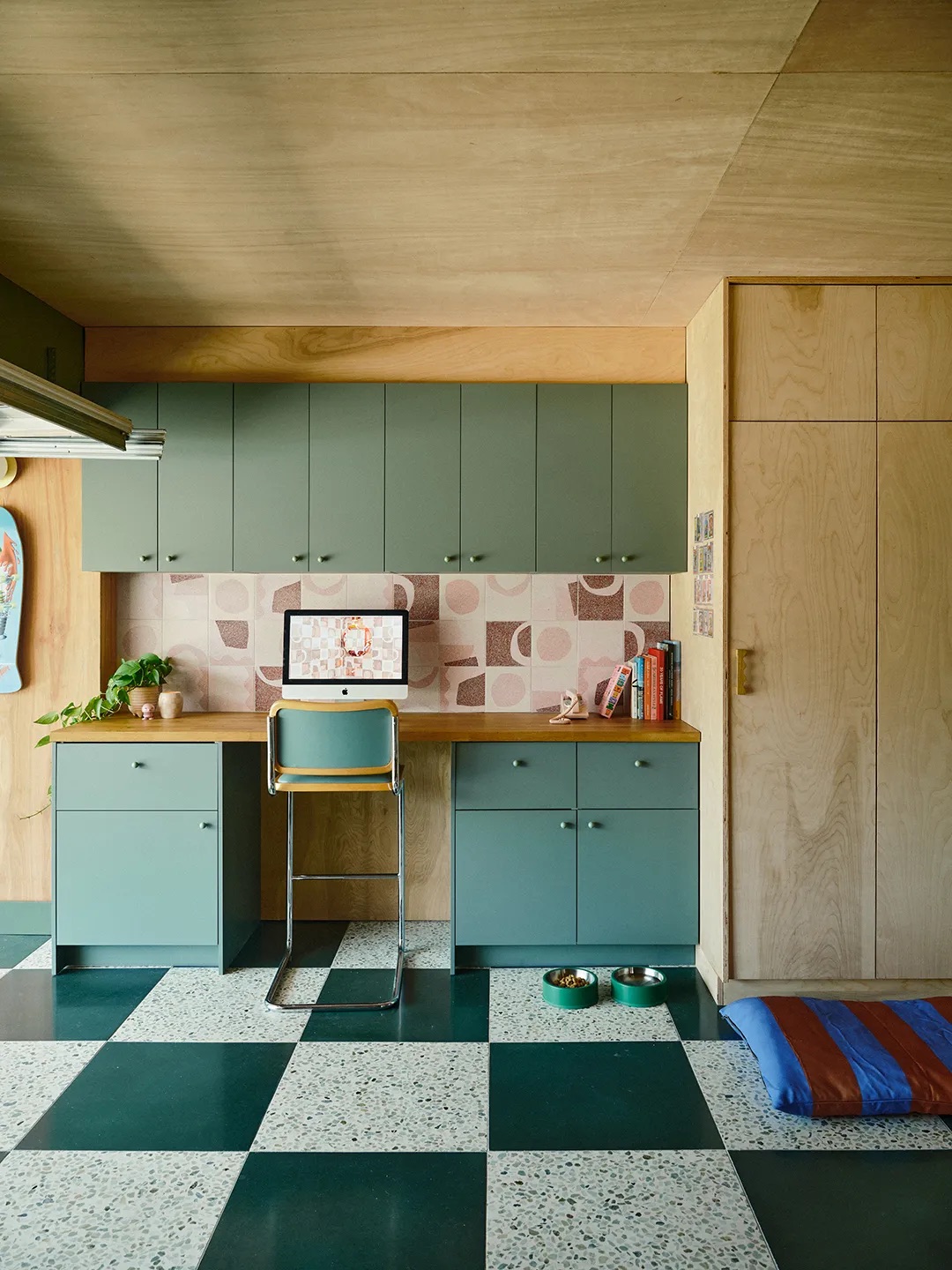 As a kid, I used to call checkerboard flooring chessboard flooring because I only ever saw it in black and white. So when I saw the cool SoCal garage of Concrete Collaborative founder Kate Balsis, I could practically feel my inner child tumble out of my chest in glee. The green-on-green terrazzo-patterned floor is equal parts calm and quirky. London-based architect Mel Bax, who worked with interior designer Laura Parkinson of Palmer & Stone to remodel her kitchen and Nick Spain of New York–based interior design studio Arthur’s, have a similar flooring mantra: Green? Check(s). —Vaishnavi Talawadekar, writer