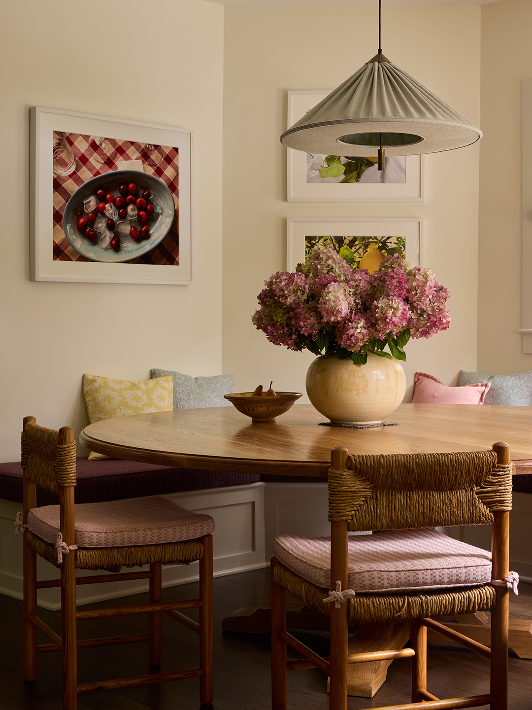 One of the very first purchases was a small-scale embroidered strawberry fabric by Chelsea Textiles, used in the twins’ bedroom (see it on the pillows in their window seat). The client fell in love immediately, because she calls the girls her “little strawberries.” That fabric set the tone for the entire project: sweet, personal, and layered with meaning.