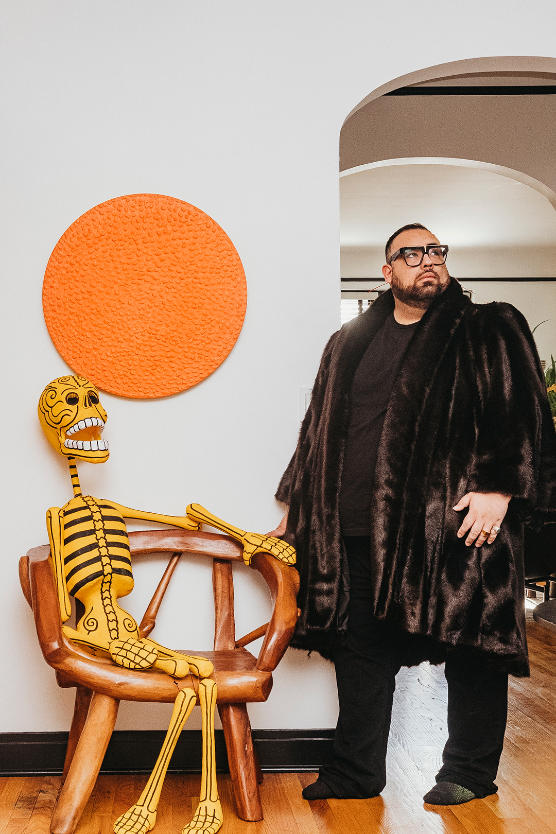 Aguilar’s expansive art collection enlivens the conversation. Guests are greeted in the front hall by a floating orange sphere—Martha (2001) by McArthur Binion—and a life-size papier-mâché skeleton purchased in Coyoacan, Mexico, near Frida Kahlo’s Blue House. A large gestural abstract by Brooklyn-based artist Kaveri Raina, titled Revolt; Internal Brewing Slow Rage (2021), sits on the mantel in the living room. (The stunning fireplace, however, is not working at the moment. “It’s conceptual,” Aguilar jokes.)