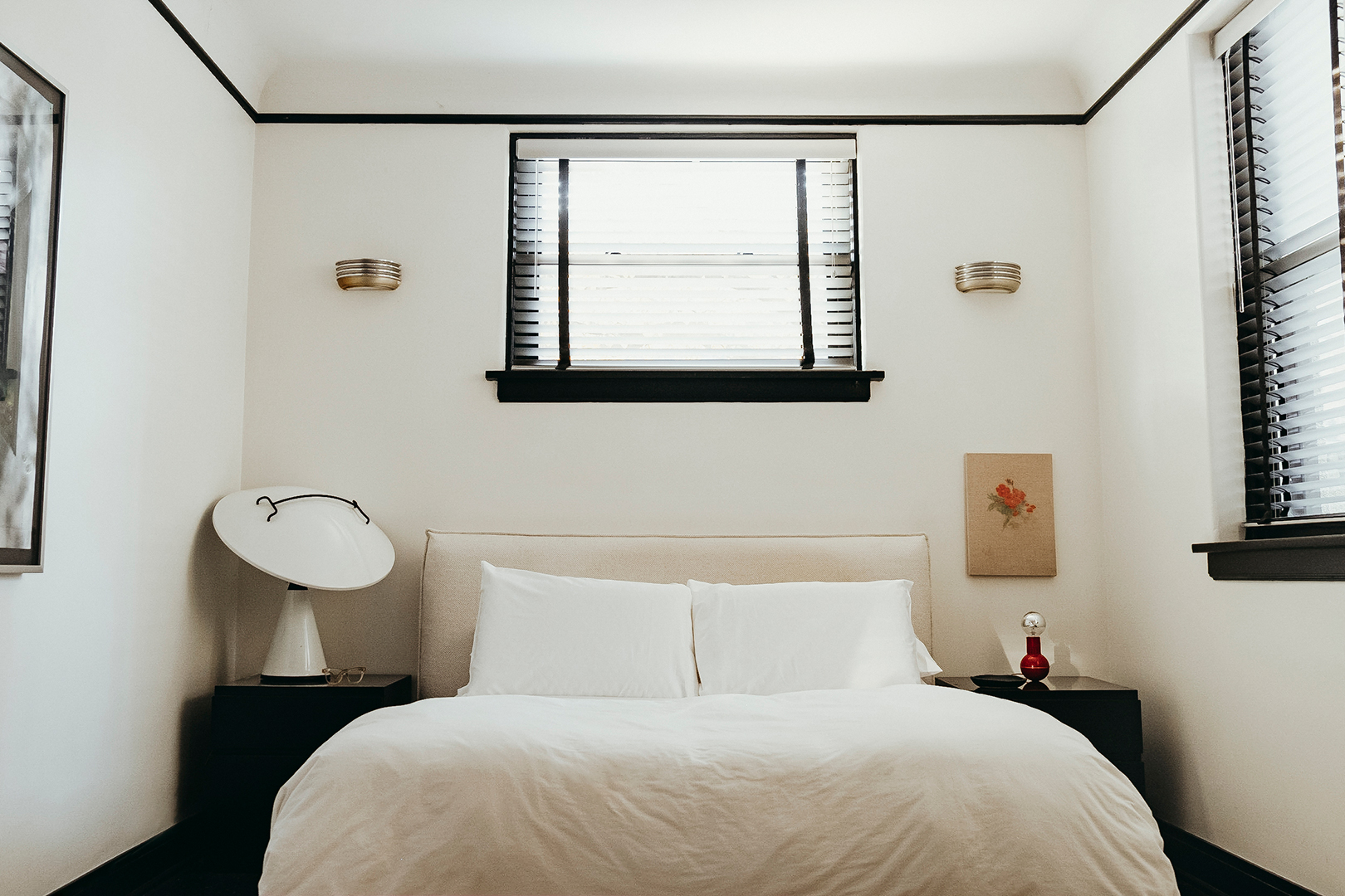 The apartment, owned by longtime friends, was in excellent shape when Aguilar got the keys, and his “renovation” required little beyond a few coats of paint. (Benjamin Moore’s “Super White” is used throughout, along with the brand’s basic black for select trim.) And while most people might have taken out the door placards, which date back to the space’s roots, Aguilar would never. He loves instructing guests to drop their bags in the “X-ray” room. The door to the basement is still marked, spookily, “Laboratory.” His own bedroom—formerly the doctor’s personal office, with the original high-shine black linoleum floors to prove it—features a “Private” door plate. The “Washroom” sign is a convenient reminder of the room’s obvious purpose.