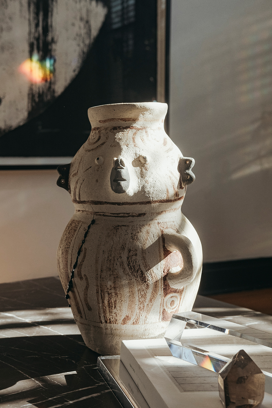 From a corner of the dining room, a potted plant reaches toward the sunlight. Its leaves graze a wall-mounted work by the Chicago artist Alex Chitty (For Another Who Isn’t, But Never Ceases to Be, 2016), forming an organic sculptural moment aided by plastic structural supports added by Aguilar’s housekeeper. “It feels even more special because it’s been touched by a mind and a decision: She taped them to the core of the plant to hold it up,” he explains. Literally and figuratively, growth invites intervention and change.