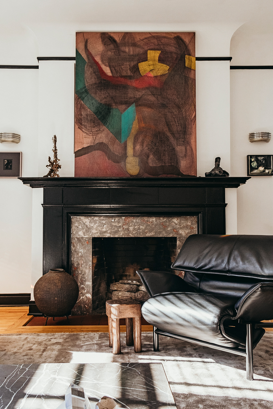 The resulting rooms put modernism and 1970s Italian design in fluent dialogue with the Art Deco architectural backdrop. Chairs by Mies Van Der Rohe flank the dining table that occupies the former exam room (the other two are Eames). A leather lounger by Vico Magistretti in the patient waiting room–turned–living room is paired with a low-slung modular sofa from Hay, and the marble coffee table is by Audo Copenhagen.