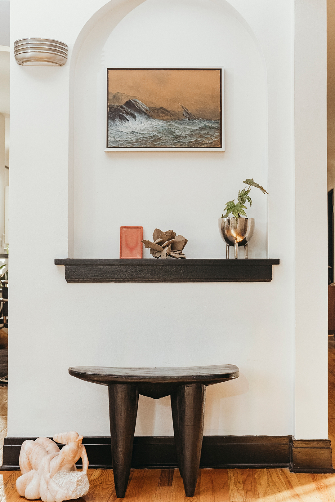 The first time Emanuel Aguilar walked through his empty apartment, he couldn’t stop marveling at its curves. The cove ceilings, crescent-shaped sconces, and subtly rounded kitchen cabinet pulls—along with an abundance of natural light—added up to a restful softness that pulled him in immediately. He was also drawn to its unique past: Situated on the first floor of a classic Chicago two-flat in the city’s Graceland West enclave, the apartment had originally functioned as the medical practice of a doctor who designed the building for live-work life in the 1920s, with his home upstairs.