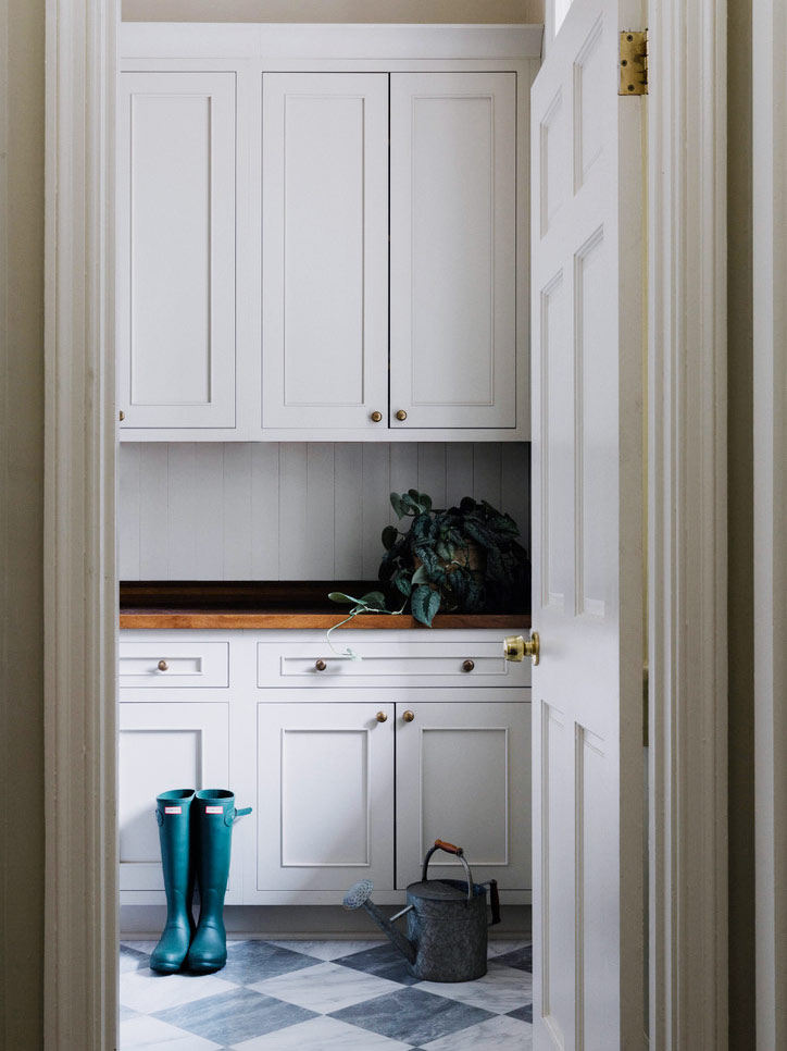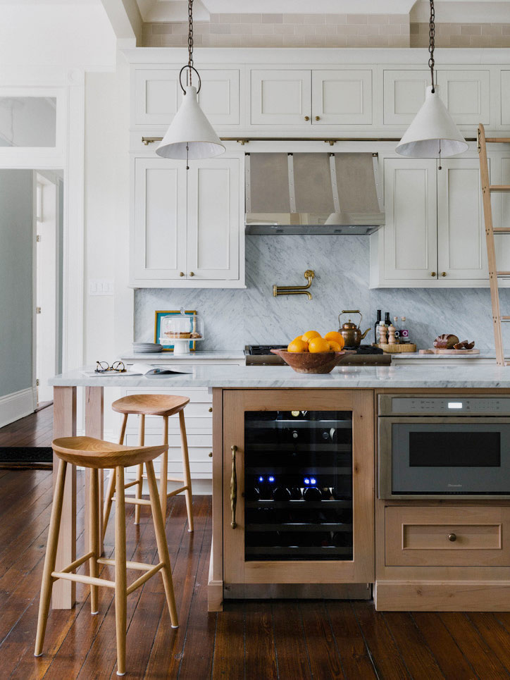 Across the hall in the kitchen, nothing had been updated since 2010, so Beryl had her hands full with a gut renovation. Because of the age of the home, it was important to the designer to use materials that would wear naturally—Carrara marble, painted oak cabinetry, and brass hardware. A skinnier-than-usual island provides just enough additional prep surface but also has potential as a homework station as the kids (now 4 and 18 months) grow up.