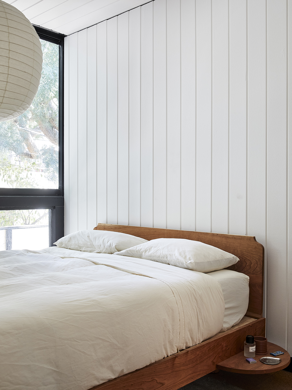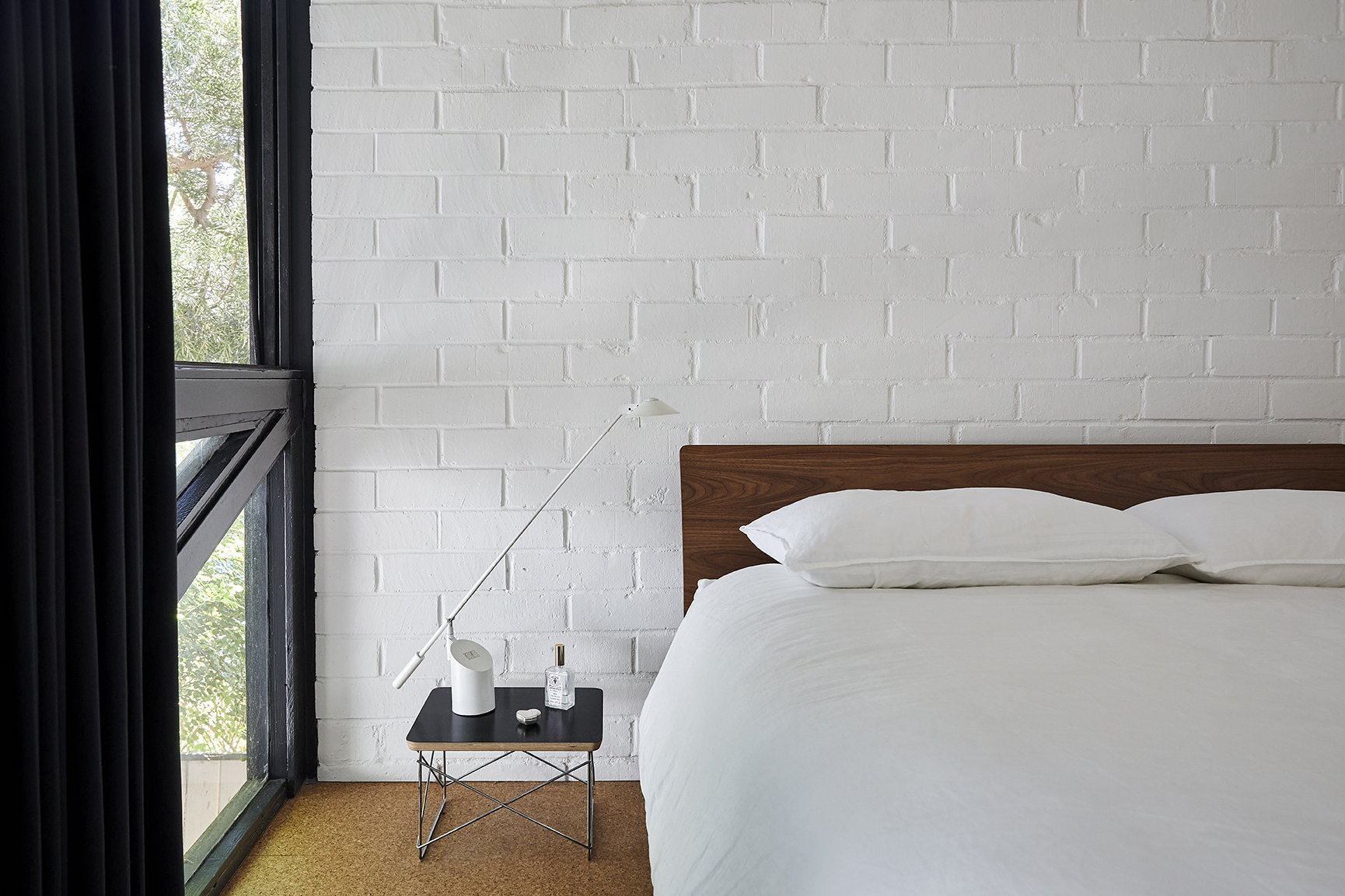 You’d never guess the apartment was in the heart of Hollywood, a feeling Starkweather doubled down on in the bedrooms, from which, miraculously, you can only see trees. She kept the decor to a bare minimum; in hers, there’s just a bed with a built-in nightstand, some Vitsoe shelving, and a rug to cozy up the cork floor. “Being busy at work and in life, I like to come home and be in a space that’s minimal without lots of clutter,” she notes.