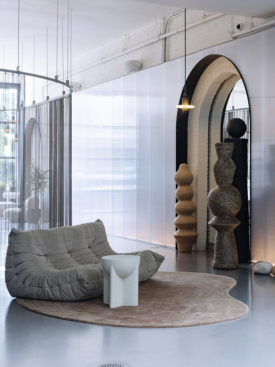 Then it was time to install those must-have mono lights. The only problem was, the arches were supposed to be a foot taller, so now they no longer lined up properly with the pendants. The remedy was reinstalling them with longer rods. Now that Karabudak had her lights just right, Bozkurt could turn his attention to his own design obsession: an original Togo sofa for the lobby. “I just couldn’t picture something with a wood or steel frame,” he says. “It had to be something blobby.” They were able to source a vintage one from Renew Finds, a secondhand shop in Greenpoint.