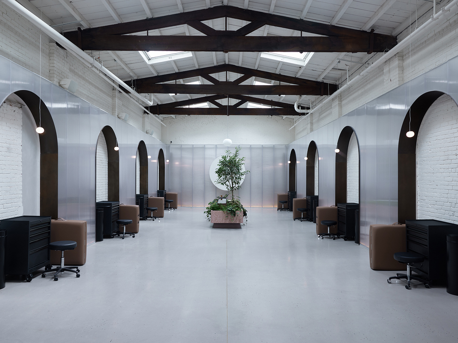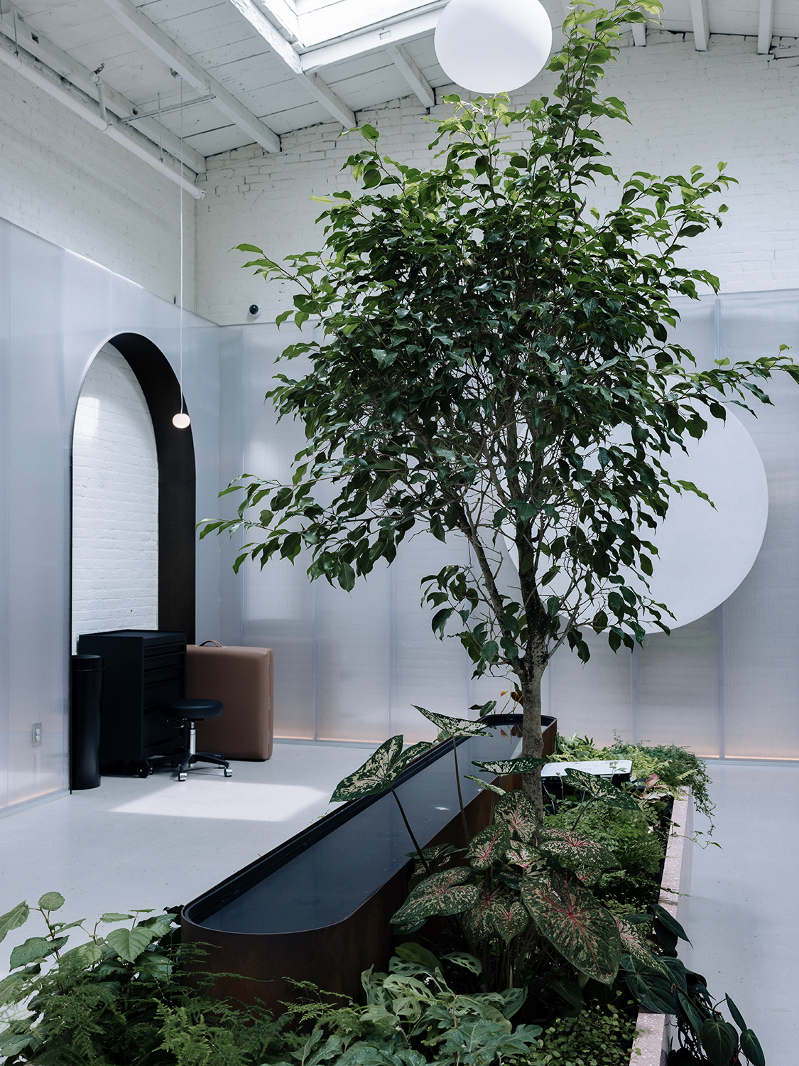 For example, you won’t find stark overhead lighting or metal music in the background here. Karabudak wanted the space to be a serene environment (there’s always a custom gardenia candle burning and curated playlist on), but the design brief was, well, brief. “All she wanted were mono lights from Apparatus and a water feature,” says Alp Bozkurt, a longtime friend of Karabudak’s and the lead architect on the project. “We bought those lights before we even had keys to the place.”