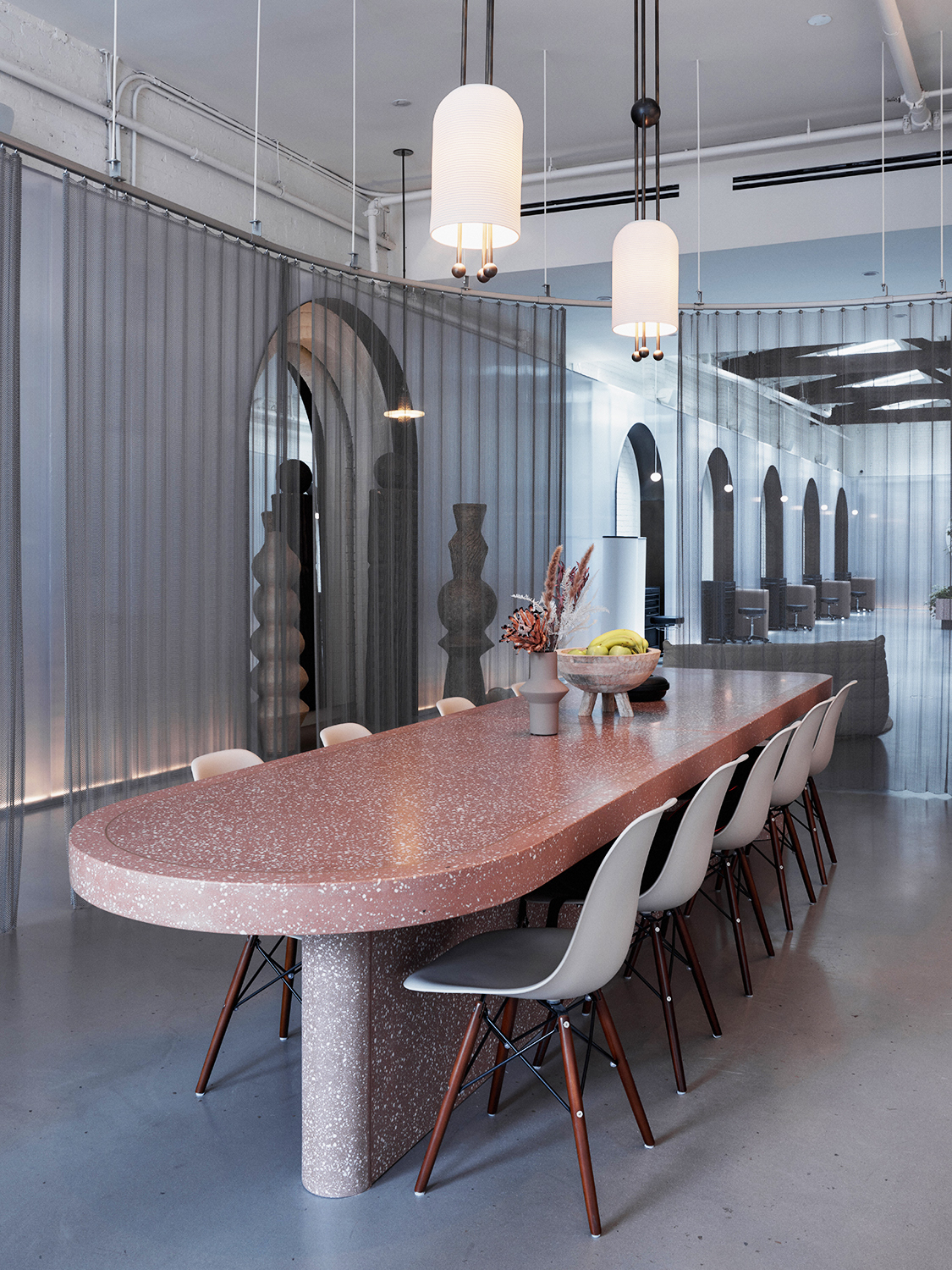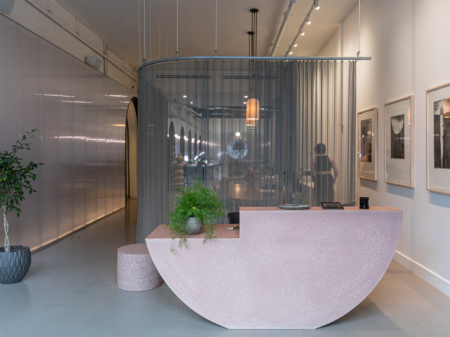 Incorporating the lights into the design was the least of Bozkurt’s worries (for now). The bigger challenge was what to do with the shotgun layout—much like a railroad apartment—to give it some sense of flow. ”It’s exciting to walk into a place with these proportions, but I hate when I walk in and in that instant, I’ve seen it all,” he says. He knew he didn’t want to do walls, so he came up with other ways to add layers to the room, like with a drape of nickel-plated metal mesh suspended from the ceiling behind the reception desk. “It creates just enough privacy where you see the action, but you’re not in it,” he adds.