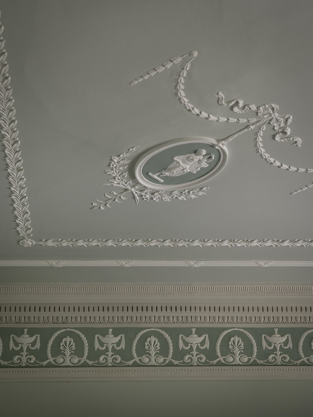 All too often, decorative moldings, including ceiling roses, have been painted over so many times that they end up losing a lot of their delicate detail. To prevent this from happening and to create an authentic look, use a specialist finish such as F&B’s Soft Distemper. Available in a range of colors, its exquisite soft powdery finish is perfect for very detailed interior plasterwork. Make sure that you check the product details for its suitability in your home, and bear in mind that the molding must not have been previously painted with an emulsion paint.