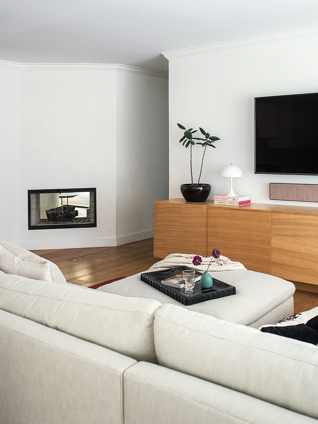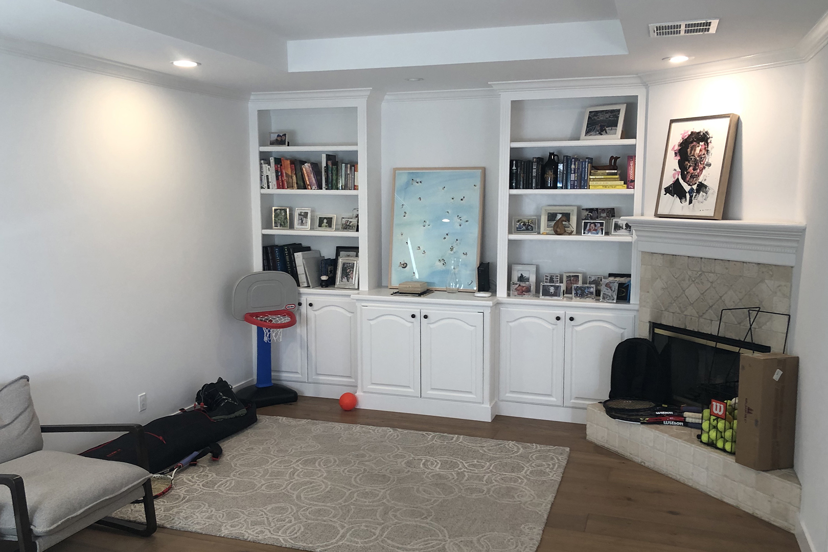 The problem: Basic white built-ins collided with a blah beige corner fireplace that never got used. “It was visually very in-your-face,” says Lee-Lim.