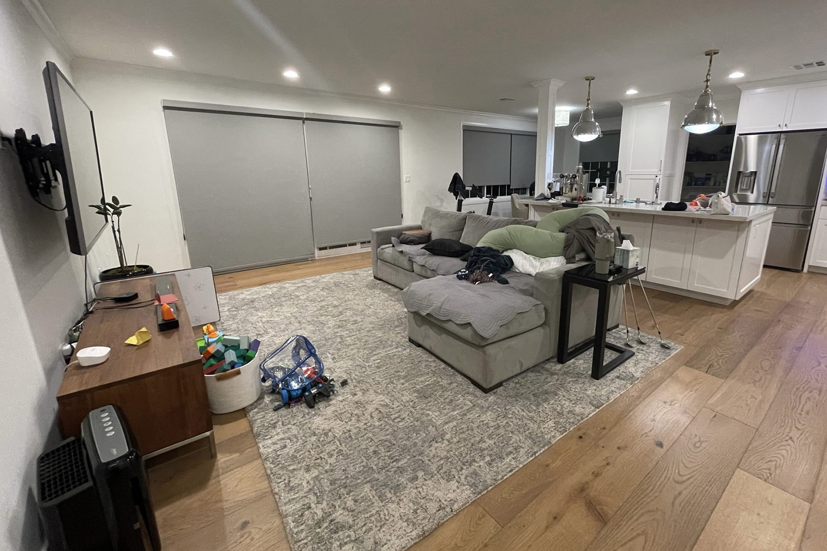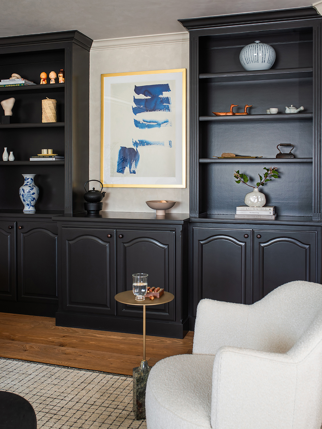 The problem: The cluttered TV area is right next to the open kitchen, and the existing sectional’s chaise cut off the room. Plus, before hiring Lee-Lim, the homeowners had a contractor update the cooking area, and the new custom roller shades throughout ended up being too dark for the home. Other than that, though, it was a blank slate for Lee-Lim to lean into her clients’ Korean roots—and bring in some built-ins.