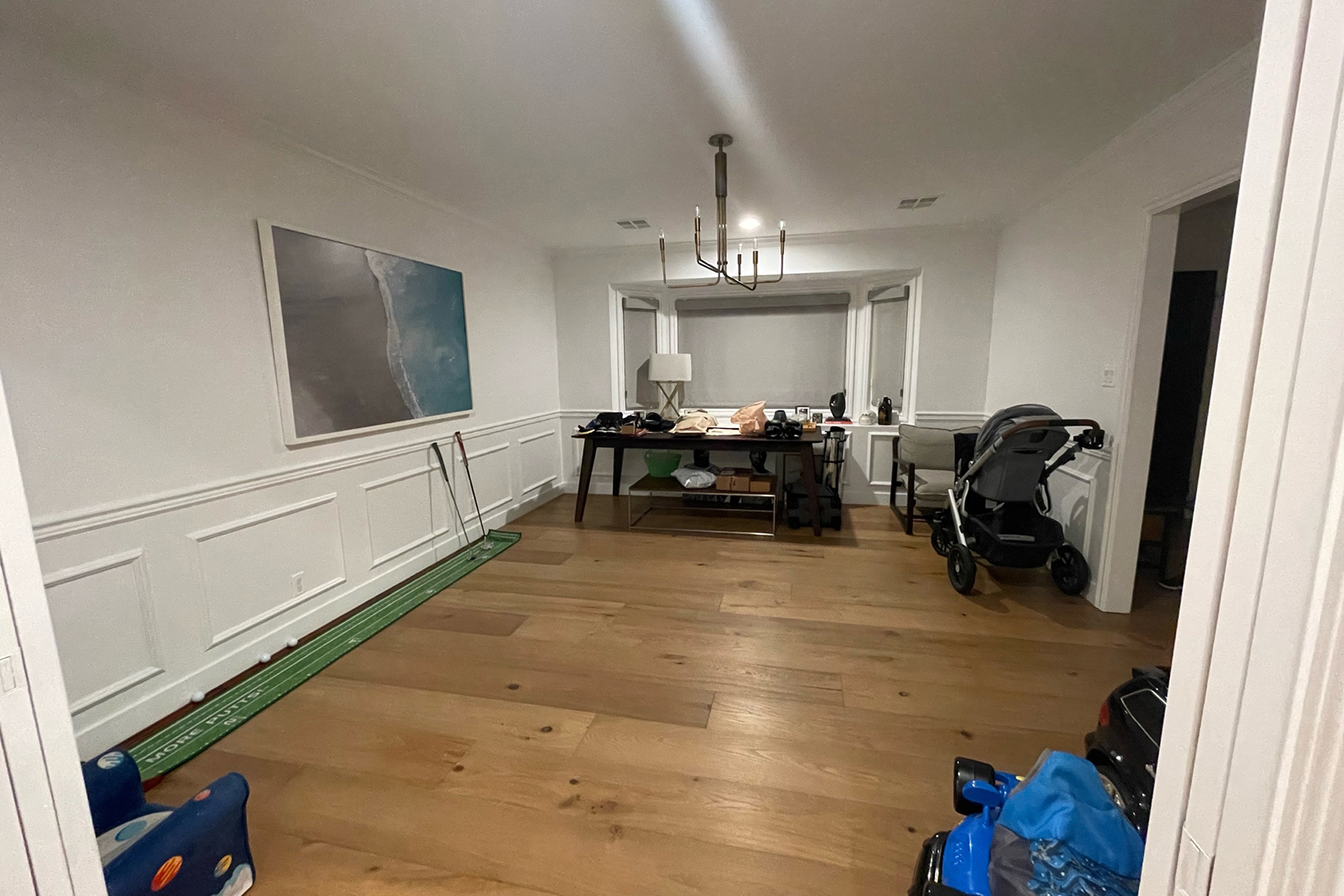 The problem: The clients admitted that they never touched their formal dining room furniture—in fact, they had actually set it aside and started using the area as a catchall for golf equipment and kids’ gear. She knew she had to change the way they viewed the space. “It’s at the front of the house, so I was like, no, no, no, this room has to be utilized!” she says.