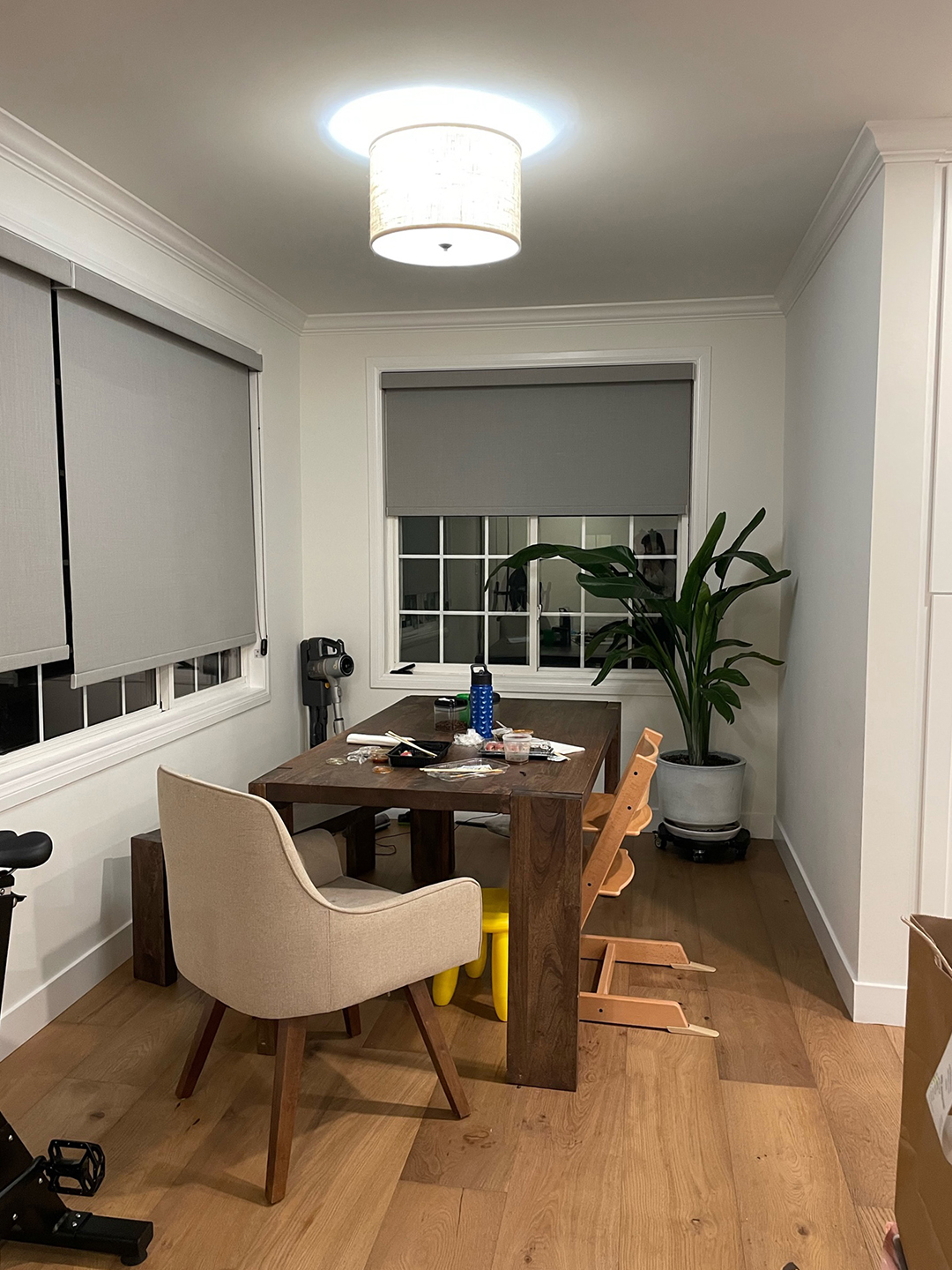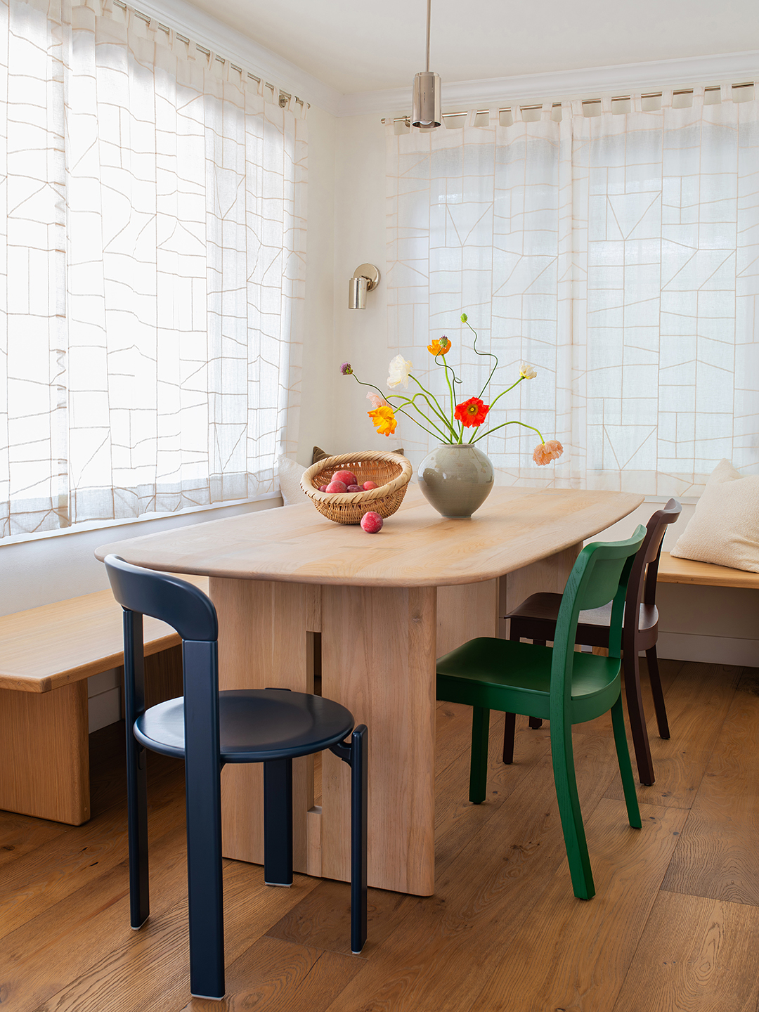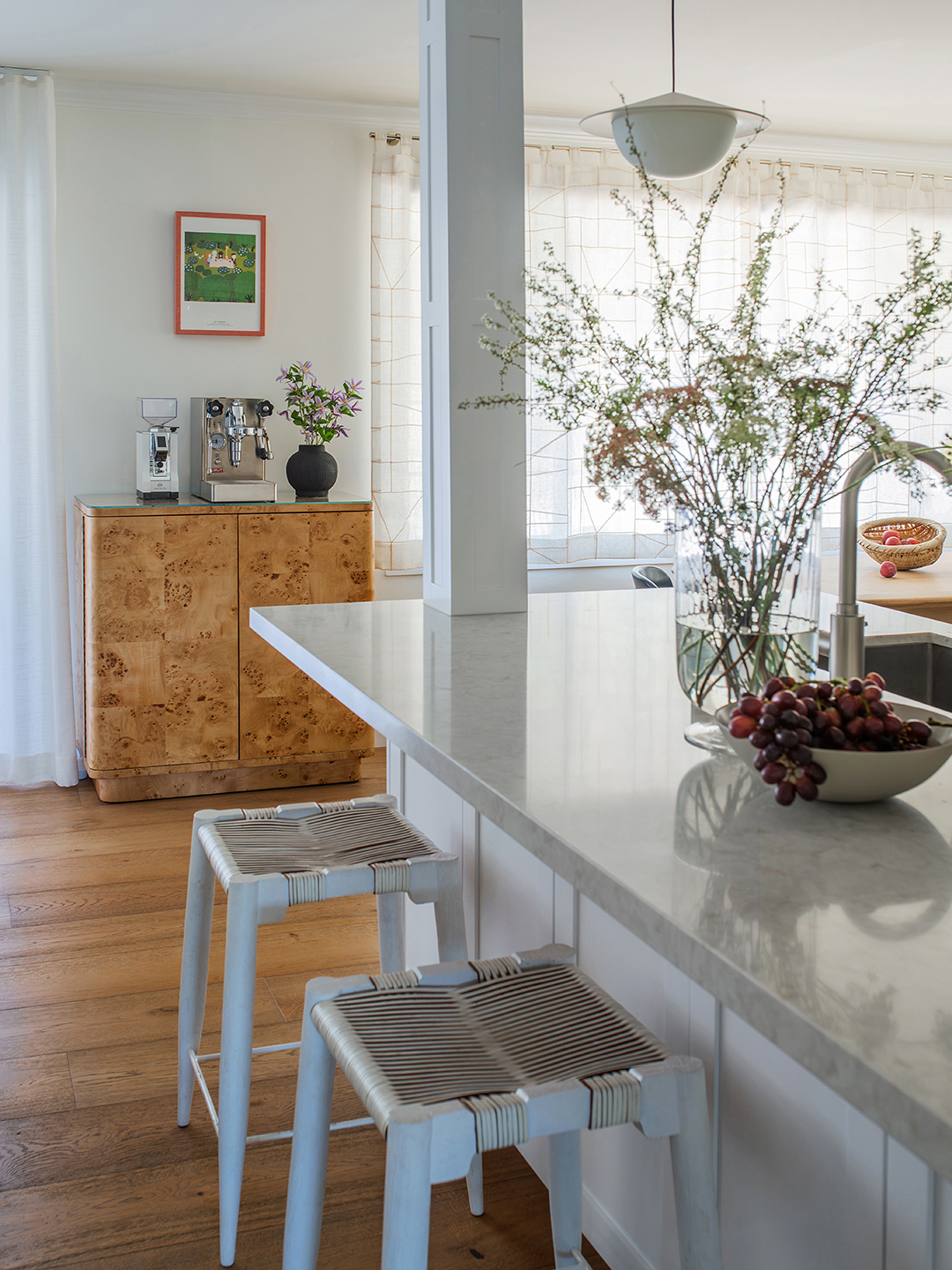 The solution: A built-in corner bench inspired by Korean café culture, plus the same colorful Hay chairs from the formal dining room around a new oval table. The breezy custom curtains above are designed to look like Korean jogakbo patchwork, but what really brightens up the space is the new lighting scheme: Lee-Lim added a wall sconce, a semi-flush mount, and a pendant lamp. “It gives you a really nice feeling in the evening. It’s very warm and moody, and it just kind of glows,” she says. And by simply topping a burl-wood bar with a piece of glass, the designer carved out the designated coffee station that they had been longing for.