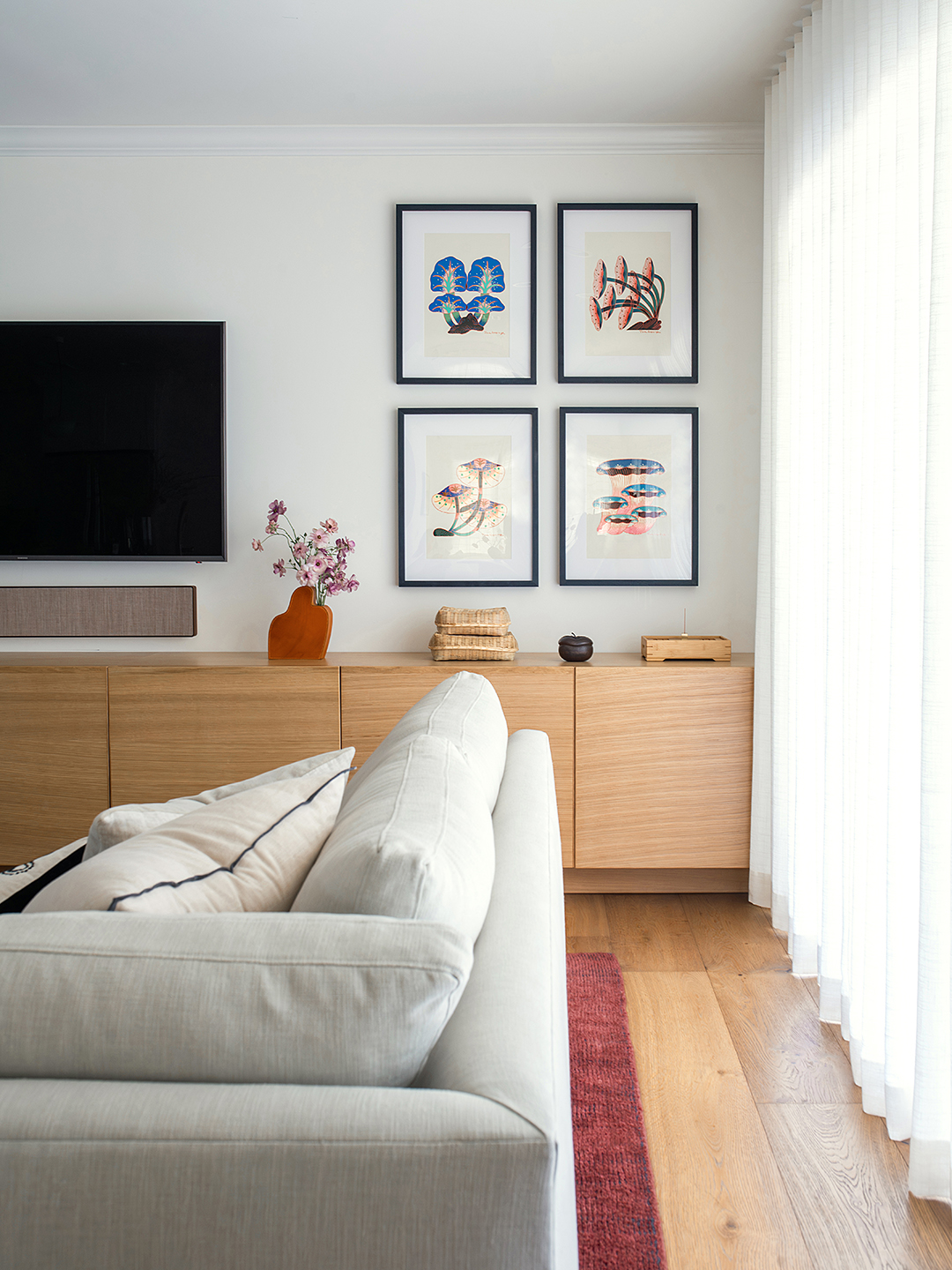 For the mess of cords and toys, Lee-Lim worked with a local woodworker to craft a long, low oak sideboard that stretches across the entire TV wall. “The size made it feel a lot warmer and gave it this Asian feel without it beating you over the head,” she says. Knowing that her clients had recently spent a lot of money on those window treatments, she came up with a compromise: layer sheer, ripple-fold track curtains on top to soften the look while still offering some privacy.
