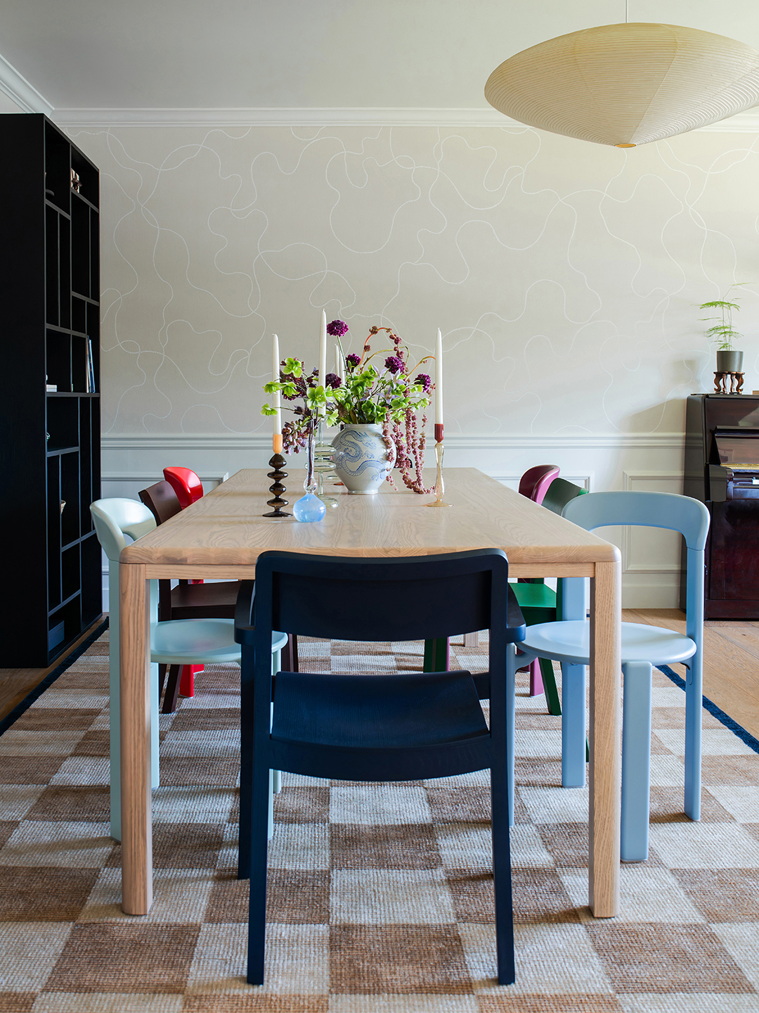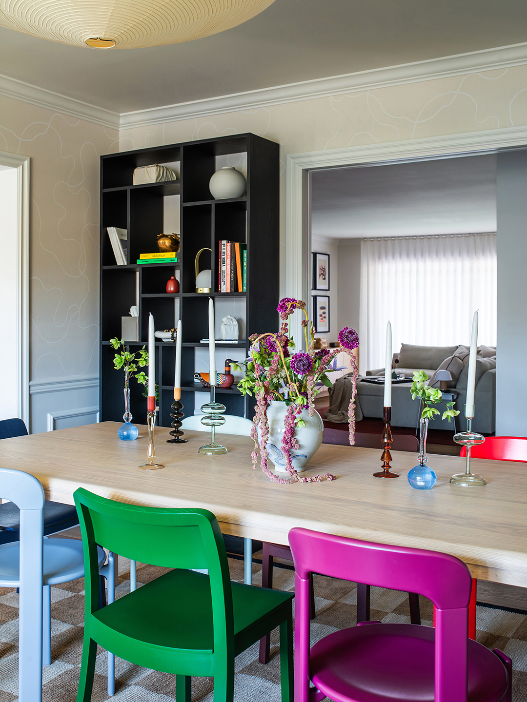 She said a final goodbye to any stuffiness by wrapping the space in a squiggly wallpaper and mixing and matching Hay’s colorful Pastis and Rey dining chairs around the table. The two large bookcases flanking either side of the threshold showcase cherished mementos from the clients’ travels, along with portable lamps they can bring out when they do decide to have friends over and want to set the mood.