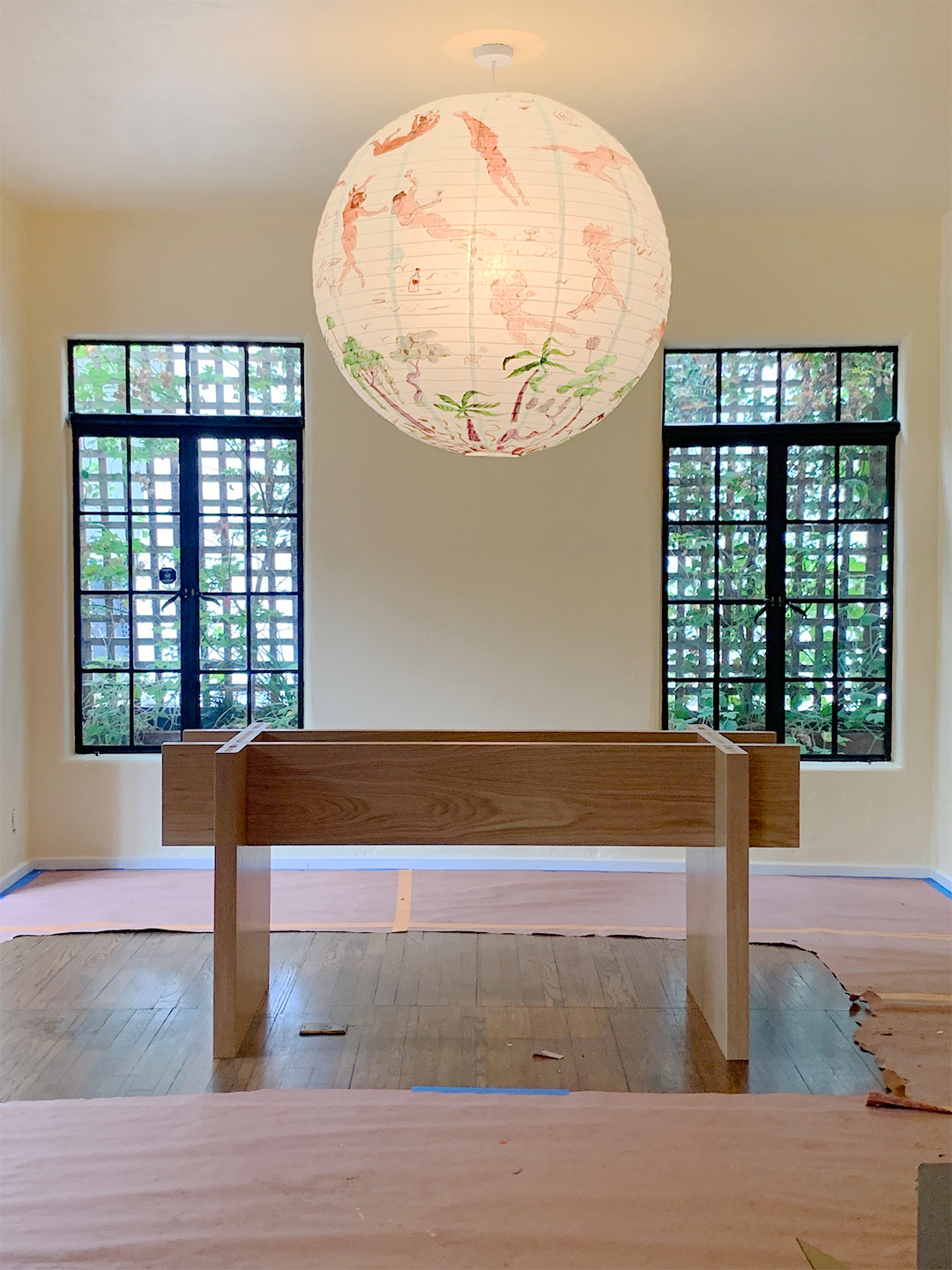 Although artist Xavier Donnelly and Ghia founder Melanie Masarin have known each other since their college days (she at Brown and he at the Rhode Island School of Design), their most magical collaboration to date has been the dining room in her company’s office, which is actually a house. (We wrote all about the space here.)